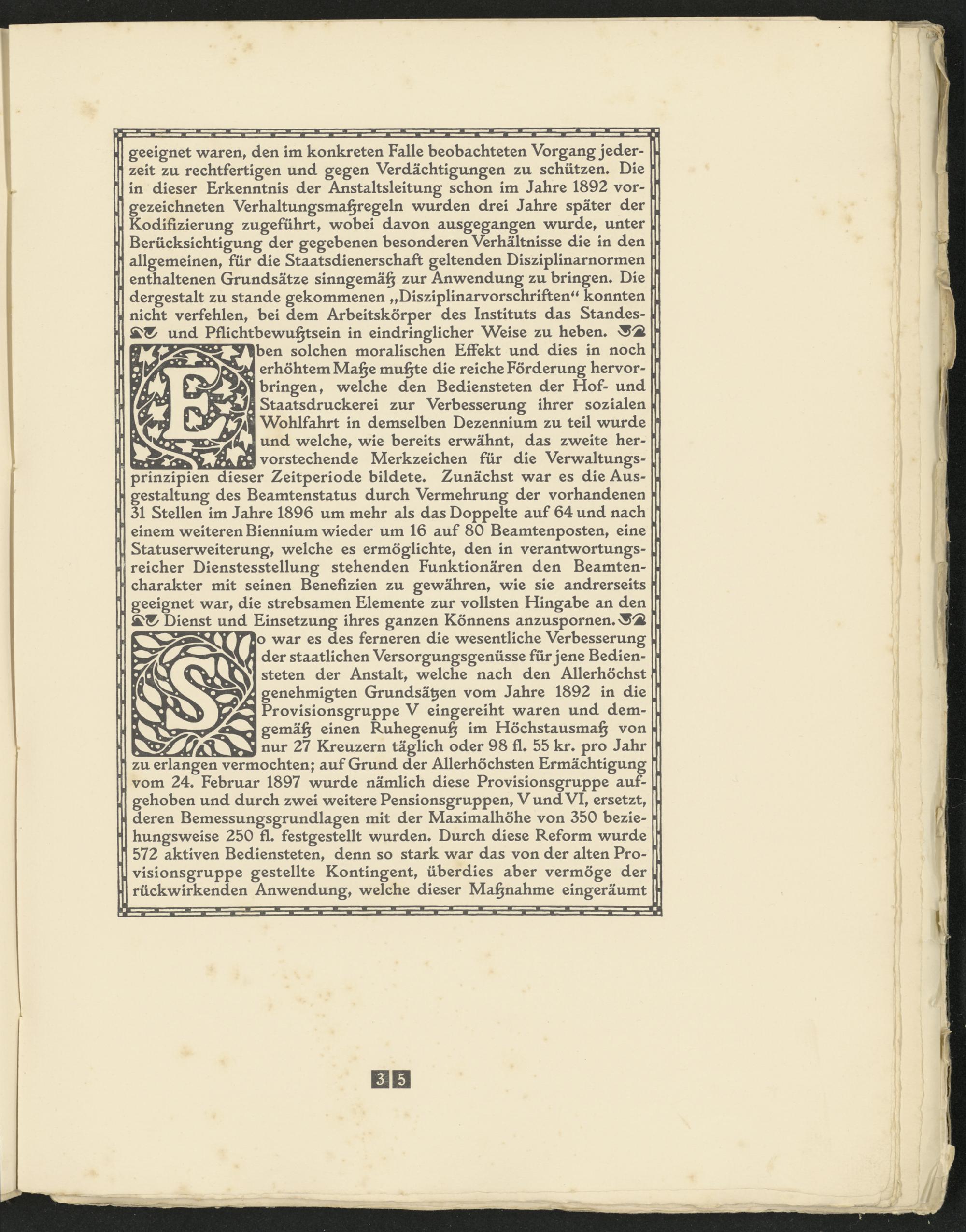 ben solchen moralischen Effekt und dies in noch erhöhtem Maße mußte die reiche Förderung hervorbringen, welche den Bediensteten der Hof- und Staatsdruckerei zur Verbesserung ihrer sozialen Wohlfahrt in demselben Dezennium zu teil wurde und welche, wie bereits erwähnt, das zweite hervorstechende Merkzeichen für die Verwaltungsprinzipien dieser Zeitperiode bildete* Zunächst war es die Ausgestaltung des Beamtenstatus durch Vermehrung der vorhandenen 31 Stellen im Jahre 1896 um mehr als das Doppelte auf 64 und nach einem weiteren Biennium wieder um 16 auf 80 Beamtenposten, eine Statuserweiterung, welche es ermöglichte, den in verantwortungsreicher Dienstesstellung stehenden Funktionären den Beamtencharakter mit seinen Benefizien zu gewähren, wie sie andrerseits geeignet war, die strebsamen Elemente zur vollsten Hingabe an den Dienst und Einsetzung ihres ganzen Könnens anzuspornen*