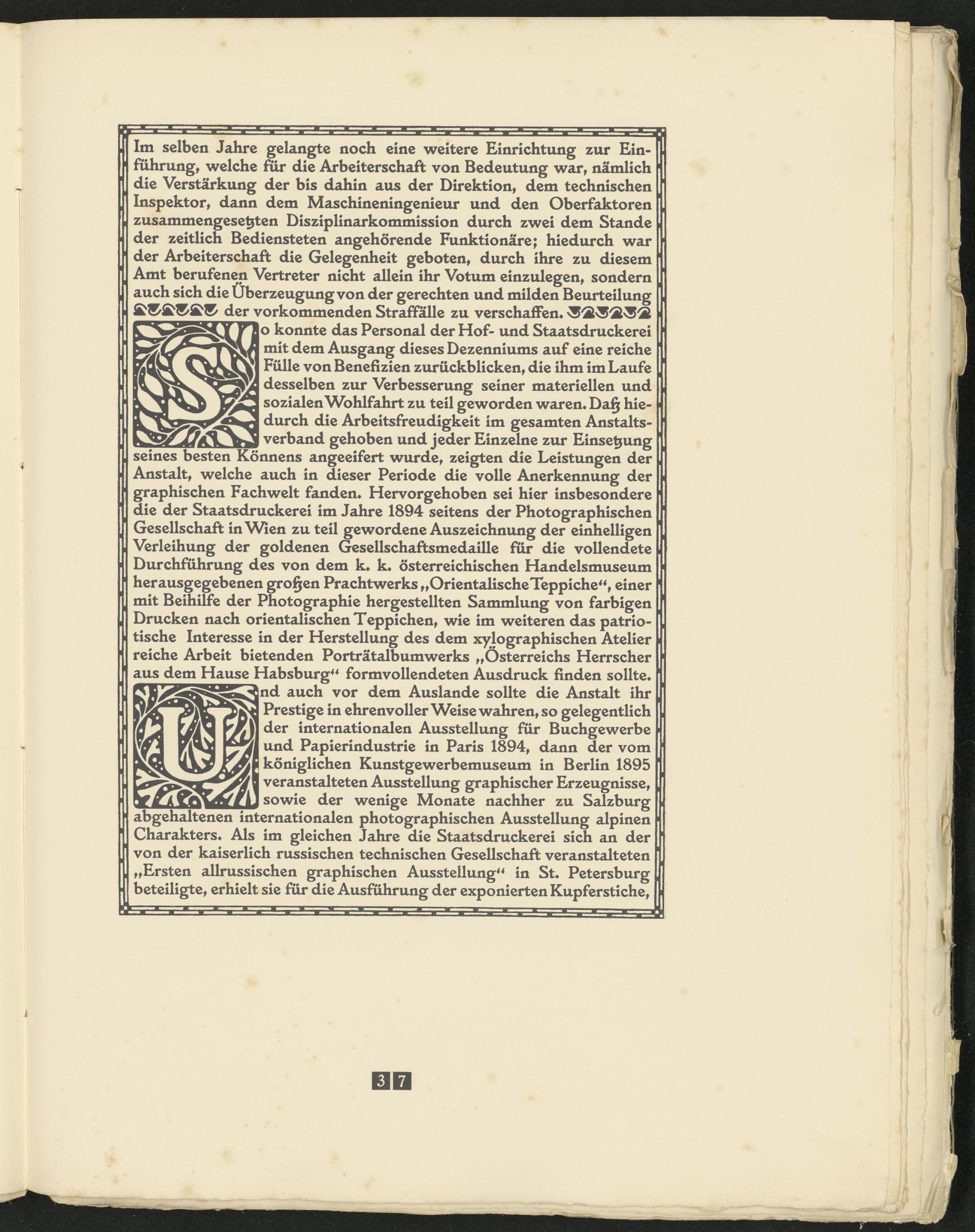 o konnte das Personal der Hof- und Staatsdruckerei mit dem Ausgang dieses Dezenniums auf eine reiche Fülle von Benefizien zurückblicken» die ihm im Laufe desselben zur Verbesserung seiner materiellen und sozialen Wohlfahrt zu teil geworden waren* Da§ hiedurch die Arbeitsfreudigkeit im gesamten Anstaltsverband gehoben und jeder Einzelne zur Einsetzung seines besten Könnens angeeifert wurde» zeigten die Leistungen der Anstalt» welche auch in dieser Periode die volle Anerkennung der graphischen Fachwelt fanden* Hervorgehoben sei hier insbesondere die der Staatsdruckerei im Jahre 1894 seitens der Photographischen Gesellschaft in Wien zu teil gewordene Auszeichnung der einhelligen Verleihung der goldenen Gesellschaftsmedaille für die vollendete Durchführung des von dem k* k* österreichischen Handelsmuseum herausgegebenen großen Prachtwerks »»OrientalischeTeppiche 44 » einer mit Beihilfe der Photographie hergestellten Sammlung von farbigen Drucken nach orientalischen Teppichen» wie im weiteren das patriotische Interesse in der Herstellung des dem xylographischen Atelier reiche Arbeit bietenden Porträtalbumwerks »»Österreichs Herrscher aus dem Hause Habsburg 44 formvollendeten Ausdruck finden sollte*