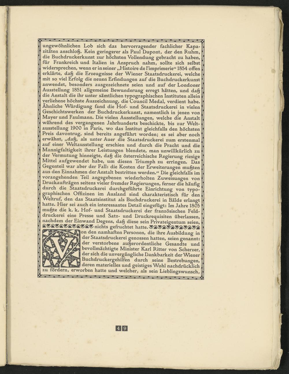 ungewöhnlichen Lob sich das hervorragender fachlicher Kapazitäten anschloß« Kein geringerer als Paul Dupont, der den Ruhm, die Buchdruckerkunst zur höchsten Vollendung gebracht zu haben, für Frankreich und Italien in Anspruch nahm, sollte sich selbst widersprechen, wenn er in seiner „Histoire de rimprimerie“ 1854 offen erklärte, daß die Erzeugnisse der Wiener Staatsdruckerei, welche mit so viel Erfolg die neuen Erfindungen auf die Buchdruckerkunst anwendet, besonders ausgezeichnete seien und auf der Londoner Ausstellung 1851 allgemeine Bewunderung erregt hätten, und daß die Anstalt die ihr unter sämtlichen typographischen Instituten allein verliehene höchste Auszeichnung, die Council Medal, verdient habe« Ähnliche Würdigung fand die Hof- und Staatsdruckerei in vielen Geschichtswerken der Buchdruckerkunst, namentlich in jenen von Mayer und Faulmann« Die vielen Ausstellungen, welche die Anstalt während des vergangenen Jahrhunderts beschickte, bis zur Weltausstellung 1900 in Paris, wo das Institut gleichfalls den höchsten Preis davontrug, sind bereits angeführt worden; es sei aber noch erwähnt, „daß, als unter Auer die Staatsdruckerei zum erstenmal auf einer Weltausstellung erschien und durch die Pracht und die Mannigfaltigkeit ihrer Leistungen blendete, man unwillkürlich zu der Vermutung hinneigte, daß die österreichische Regierung riesige Mittel aufgewendet habe, um diesen Triumph zu erringen« Das Gegenteil war aber der Fall: die Kosten der Erweiterungen mußten aus den Einnahmen der Anstalt bestritten werden«“ Die gleichfalls im vorangehenden Teil angegebenen wiederholten Zuweisungen von Druckaufträgen seitens vieler fremder Regierungen, ferner die häufig durch die Staatsdruckerei durchgeführte Einrichtung von typographischen Offizinen im Ausland sind charakteristisch für den Weltruf, den das Staatsinstitut als Buchdruckerei in Bälde erlangt hatte« Hier sei auch ein interessantes Detail eingefügt: Im Jahre 1805 mußte die k« k« Hof- und Staatsdruckerei der französischen Felddruckerei eine Presse und Satz- und Druckrequisiten überlassen, nachdem der Einwand Degens, daß diese sein Privateigentum seien,