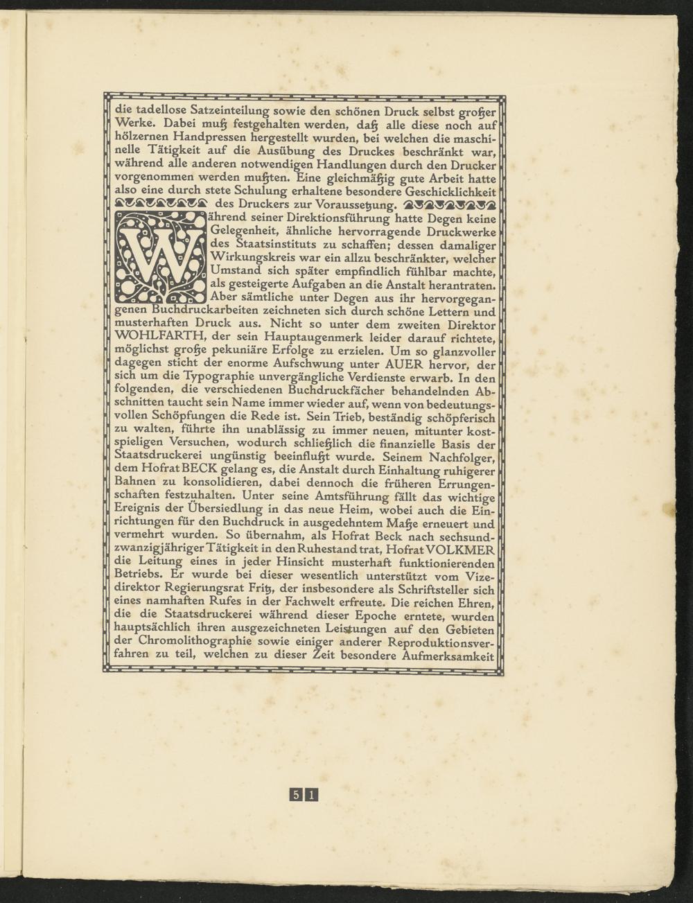 des Druckers zur Voraussetzung. ährend seiner Direktionsführung hatte Degen keine Gelegenheit, ähnliche hervorragende Druckwerke des Staatsinstituts zu schaffen; dessen damaliger Wirkungskreis war ein allzu beschränkter, welcher Umstand sich später empfindlich fühlbar machte, als gesteigerte Aufgaben an die Anstalt herantraten. _Aber sämtliche unter Degen aus ihr hervorgegangenen Buchdruckarbeiten zeichneten sich durch schöne Lettern und musterhaften Druck aus. Nicht so unter dem zweiten Direktor WOHLFARTH, der sein Hauptaugenmerk leider darauf richtete, möglichst große pekuniäre Erfolge zu erzielen. Um so glanzvoller dagegen sticht der enorme Aufschwung unter AUER hervor, der sich um die Typographie unvergängliche Verdienste erwarb. In den folgenden, die verschiedenen Buchdruckfacher behandelnden Abschnitten taucht sein Name immer wieder auf, wenn von bedeutungsvollen Schöpfungen die Rede ist. Sein Trieb, beständig schöpferisch zu walten, führte ihn unablässig zu immer neuen, mitunter kostspieligen Versuchen, wodurch schließlich die finanzielle Basis der Staatsdruckerei ungünstig beeinflußt wurde. Seinem Nachfolger, dem Hofrat BECK gelang es, die Anstalt durch Einhaltung ruhigerer Bahnen zu konsolidieren, dabei dennoch die früheren Errungenschaften festzuhalten. Unter seine Amtsführung fallt das wichtige Ereignis der Übersiedlung in das neue Heim, wobei auch die Einrichtungen für den Buchdruck in ausgedehntem Maße erneuert und vermehrt wurden. So übernahm, als Hofrat Beck nach sechsundzwanzigjähriger Tätigkeit in den Ruhestand trat, Hofrat VOLKMER die Leitung eines in jeder Hinsicht musterhaft funktionierenden Betriebs. Er wurde bei dieser wesentlich unterstützt vom Vizedirektor Regierungsrat Fritz, der insbesondere als Schriftsteller sich eines namhaften Rufes in der Fachwelt erfreute. Die reichen Ehren, die die Staatsdruckerei während dieser Epoche erntete, wurden hauptsächlich ihren ausgezeichneten Leistungen auf den Gebieten der Chromolithographie sowie einiger anderer Reproduktionsverfahren zu teil, welchen zu dieser Zeit besondere Aufmerksamkeit