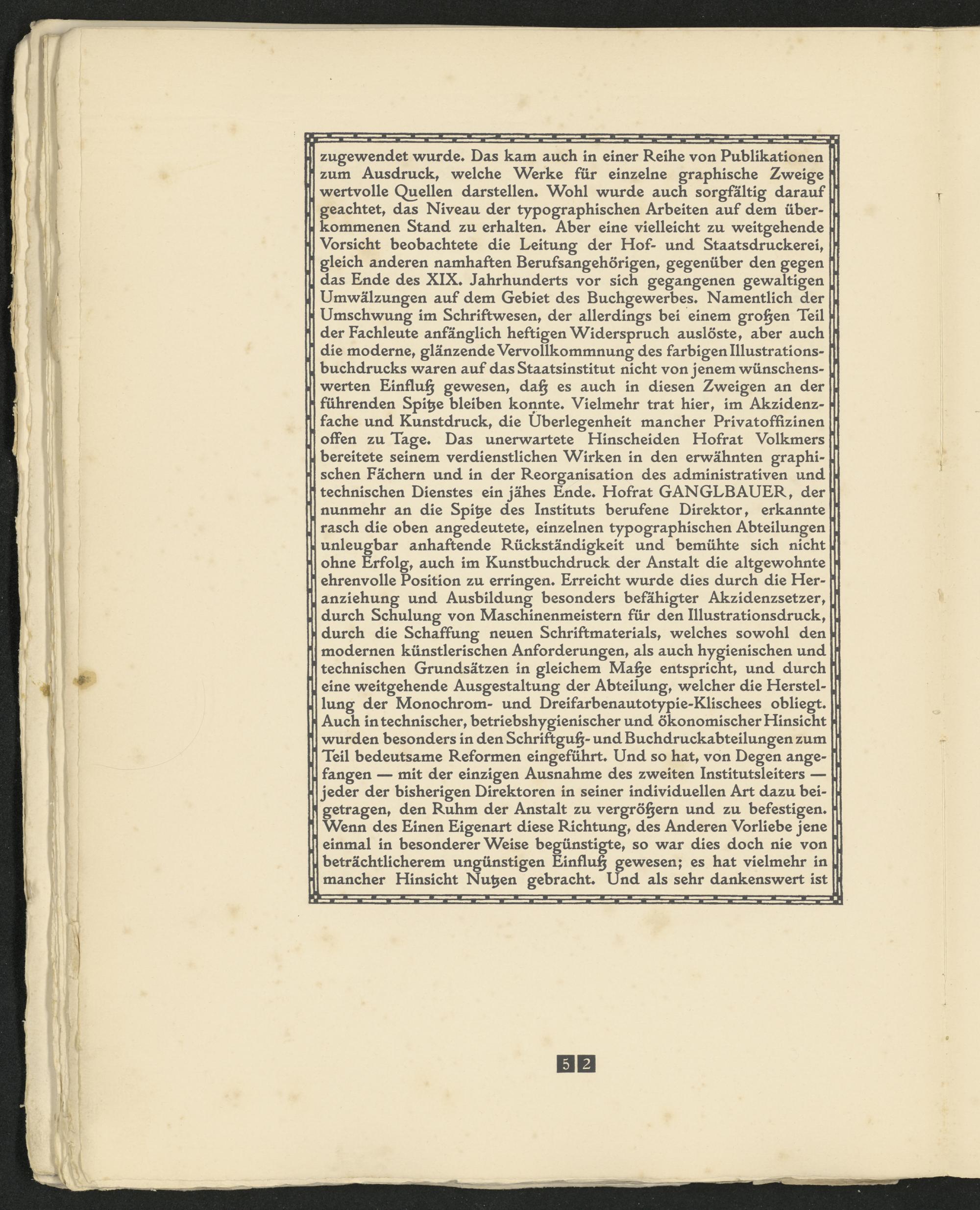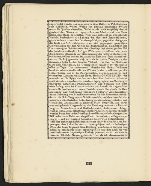 zugewendet wurde* Das kam auch in einer Reihe von Publikationen zum Ausdruck, welche Werke für einzelne graphische Zweige wertvolle Quellen darstellen« Wohl wurde auch sorgfältig darauf geachtet, das Niveau der typographischen Arbeiten auf dem überkommenen Stand zu erhalten« Aber eine vielleicht zu weitgehende Vorsicht beobachtete die Leitung der Hof- und Staatsdruckerei, gleich anderen namhaften Berufsangehörigen, gegenüber den gegen das Ende des XIX» Jahrhunderts vor sich gegangenen gewaltigen Umwälzungen auf dem Gebiet des Buchgewerbes« Namentlich der Umschwung im Schriftwesen, der allerdings bei einem großen Teil der Fachleute anfänglich heftigen Widerspruch auslöste, aber auch die moderne, glänzende Vervollkommnung des farbigen Illustrationsbuchdrucks waren auf das Staatsinstitut nicht von jenem wünschenswerten Einfluß gewesen, da§ es auch in diesen Zweigen an der führenden Spitze bleiben konnte« Vielmehr trat hier, im Akzidenzfache und Kunstdruck, die Überlegenheit mancher Privatoffizinen offen zu Tage« Das unerwartete Hinscheiden Hofrat Volkmers bereitete seinem verdienstlichen Wirken in den erwähnten graphischen Fächern und in der Reorganisation des administrativen und technischen Dienstes ein jähes Ende« Hofrat GANGLBAUER, der nunmehr an die Spitze des Instituts berufene Direktor, erkannte rasch die oben angedeutete, einzelnen typographischen Abteilungen unleugbar anhaftende Rückständigkeit und bemühte sich nicht ohne Erfolg, auch im Kunstbuchdruck der Anstalt die altgewohnte ehrenvolle Position zu erringen« Erreicht wurde dies durch die Heranziehung und Ausbildung besonders befähigter Akzidenzsetzer, durch Schulung von Maschinenmeistern für den Illustrationsdruck, durch die Schaffung neuen Schriftmaterials, welches sowohl den modernen künstlerischen Anforderungen, als auch hygienischen und technischen Grundsätzen in gleichem Ma§e entspricht, und durch eine weitgehende Ausgestaltung der Abteilung, welcher die Herstellung der Monochrom- und Dreifarbenautotypie-Klischees obliegt« Auch in technischer, betriebshygienischer und ökonomischer Hinsicht wurden besonders in den Schriftgu§- und Buchdruckabteilungen zum Teil bedeutsame Reformen eingeführt« Und so hat, von Degen angefangen — mit der einzigen Ausnahme des zweiten Institutsleiters — jeder der bisherigen Direktoren in seiner individuellen Art dazu beigetragen, den Ruhm der Anstalt zu vergrö§ern und zu befestigen« Wenn des Einen Eigenart diese Richtung, des Anderen Vorliebe jene einmal in besondererWeise begünstigte, so war dies doch nie von beträchtlicherem ungünstigen Einfluß gewesen; es hat vielmehr in mancher Hinsicht Nutzen gebracht« Und als sehr dankenswert ist