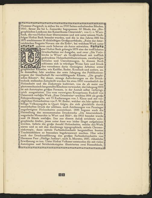 nter Hofrat Beck gelangte 1879 eine der trefflichsten Druckarbeiten zur Ausgabe, und zwar „Die Votivkirche in Wien“ als Gro§folioband mit trefflich gedruckten Holzschnittillustrationen, zweifarbigen Initialen und Umrahmungen» In diesem Buch schlossen sich in würdiger Weise Satz und Druck den vornehmen darin vereinigten Arbeiten erster graphischer Künstler, wie Knöfler, Bader, Kozeluch und andere, an» In demselben Jahr erschien der erste Jahrgang des Publikationsorgans der Gesellschaft für vervielfältigende Künste, „Die graphischen Künste“» Bei dieser, strenge Anforderungen an die Drucktechnik stellenden Zeitschrift wurden bis etwa 1900 vornehmlich der Holzschnitt und die Zinkotypie kultiviert, von da ab meist nur photomechanisch hergestellte Klischees verwendet; der Jahrgang 1903 ist mit Autotypien großen Formats, in der Anstalt selbst verfertigt, reich ausgestattet» Das vom verewigten Kronprinzen Rudolf von Österreich verfaßte Werk „Eine Orientreise“ erschien 1884 als gro§e Folioprachtausgabe, mit 73 Radierungen von J* Klaus und mit vorzüglichen Holzschnitten von F» W» Bader, welcher ein Jahr später die billige Volksausgabe in Quart folgte, die sich gleichfalls durch musterhaften Druck der schönen, nach Zeichnungen von Pausinger angefertigten Holzschnitte auszeichnet» 1885 begann auch die Herstellung des monumentalen Druckwerks „Die österreichischungarische Monarchie in Wort und Bild“, die 1902 beendet wurde und 24 Bände umfaßte» Das aus diesem Anla§ errichtete xylo- graphische Atelier, jenes unter Auer war leider längst aufgelassen worden, lieferte die gro§e Anzahl Holzschnitte, welche das Werk zieren und es mit den durchwegs typographisch, mittels Chromo- zinkotypie, dann mittels Farbenholzschnitt hergestellten bunten Trachtenbildern so besonders begehrenswert machen» Hier wäre auch der Druckausführung des großen Farbenholzschnitts von Hermann Paar „Heilige Justina“, nach A» Moretto, 1887, rühmliche Erwähnung zu tun» Unter Hofrat Volkmer entstanden die mit vielen Autotypien und Strichzinkotypien illustrierten zwei Riesenbände,