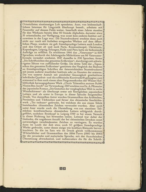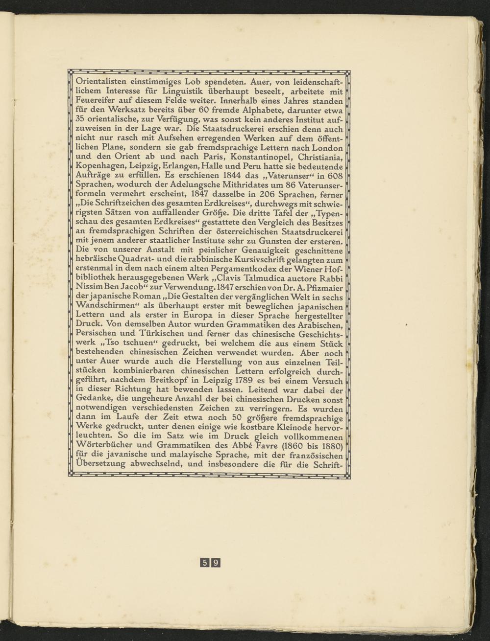 Orientalisten einstimmiges Lob spendeten« Auer, von leidenschaftlichem Interesse für Linguistik überhaupt beseelt, arbeitete mit Feuereifer auf diesem Felde weiter« Innerhalb eines Jahres standen für den Werksatz bereits über 60 fremde Alphabete, darunter etwa 35 orientalische, zur Verfügung, was sonst kein anderes Institut aufzuweisen in der Lage war« Die Staatsdruckerei erschien denn auch nicht nur rasch mit Aufsehen erregenden Werken auf dem öffentlichen Plane, sondern sie gab fremdsprachige Lettern nach London und den Orient ab und nach Paris, Konstantinopel, Christiania, Kopenhagen, Leipzig, Erlangen, Halle und Peru hatte sie bedeutende Aufträge zu erfüllen« Es erschienen 1844 das „Vaterunser“ in 608 Sprachen, wodurch der Adelungsche Mithridates um 86 Vaterunserformeln vermehrt erscheint, 1847 dasselbe in 206 Sprachen, ferner „Die Schriftzeichen des gesamten Erdkreises“, durchwegs mit schwierigsten Sätzen von auffallender Grö§e« Die dritte Tafel der „Typenschau des gesamten Erdkreises“ gestattete den Vergleich des Besitzes an fremdsprachigen Schriften der österreichischen Staatsdruckerei mit jenem anderer staatlicher Institute sehr zu Gunsten der ersteren. Die von unserer Anstalt mit peinlicher Genauigkeit geschnittene hebräische Quadrat- und die rabbinische Kursivschrift gelangten zum erstenmal in dem nach einem alten Pergamentkodex der Wiener Hofbibliothek herausgegebenen Werk „Clavis Talmudica auctore Rabbi Nissim Ben Jacob“ zur Verwendung« 1847 erschien von Dr« A« Pfizmaier der japanische Roman „Die Gestalten der vergänglichen Welt in sechs Wandschirmen“ als überhaupt erster mit beweglichen japanischen Lettern und als erster in Europa in dieser Sprache hergestellter Druck« Von demselben Autor wurden Grammatiken des Arabischen, Persischen und Türkischen und ferner das chinesische Geschichtswerk „Tso tschuen“ gedruckt, bei welchem die aus einem Stück bestehenden chinesischen Zeichen verwendet wurden« Aber noch unter Auer wurde auch die Herstellung von aus einzelnen Teilstücken kombinierbaren chinesischen Lettern erfolgreich durchgeführt, nachdem Breitkopf in Leipzig 1789 es bei einem Versuch in dieser Richtung hat bewenden lassen« Leitend war dabei der Gedanke, die ungeheure Anzahl der bei chinesischen Drucken sonst notwendigen verschiedensten Zeichen zu verringern« Es wurden dann im Laufe der Zeit etwa noch 50 größere fremdsprachige Werke gedruckt, unter denen einige wie kostbare Kleinode hervorleuchten. So die im Satz wie im Druck gleich vollkommenen Wörterbücher und Grammatiken des Abbe Favre (1860 bis 1880) für die javanische und malayische Sprache, mit der französischen Übersetzung abwechselnd, und insbesondere die für die Schrift-