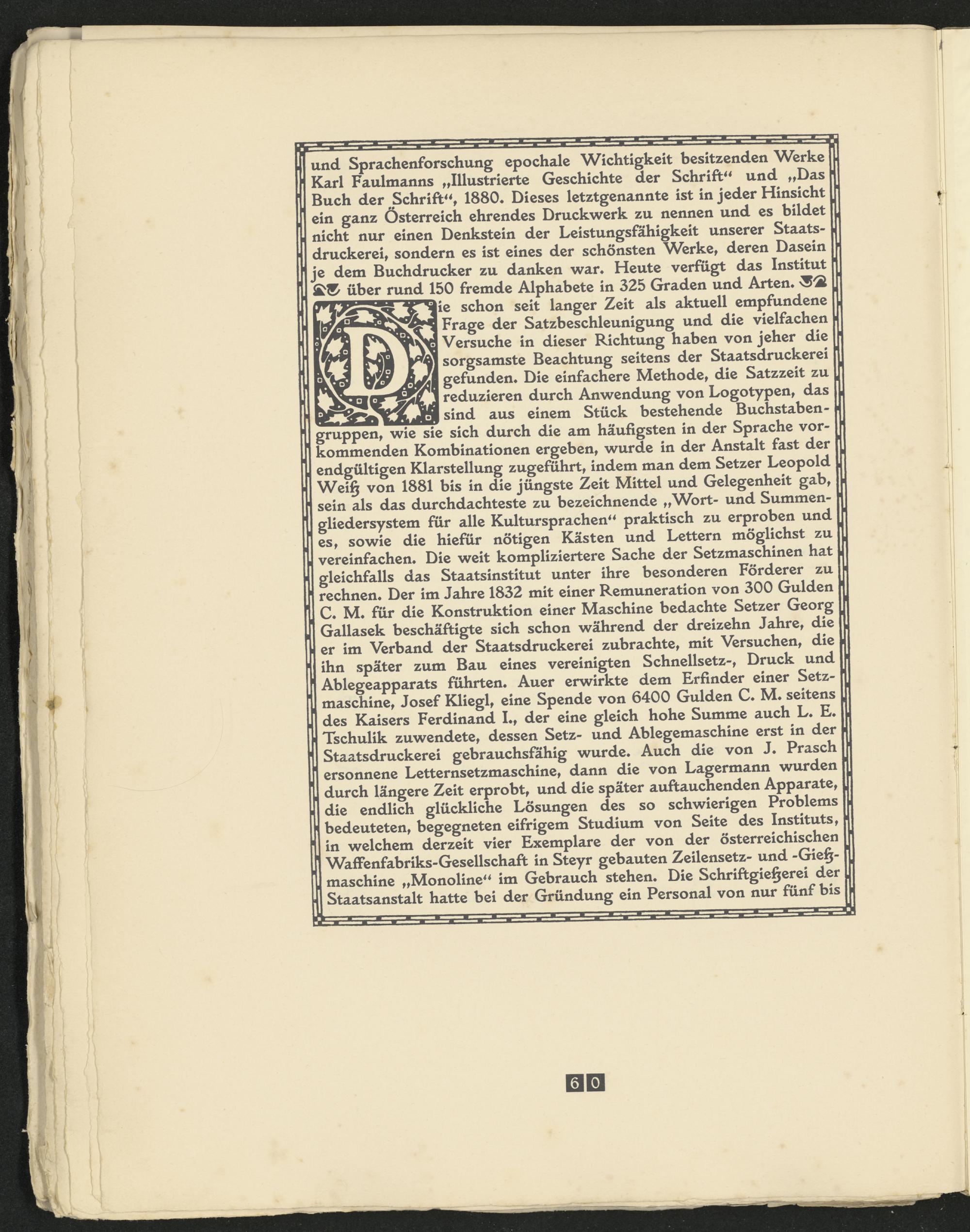 und Sprachenforschung epochale Wichtigkeit besitzenden Werke Karl Faulmanns „Illustrierte Geschichte der Schrift 44 und „Das Buch der ^Schrift 44 , 1880* Dieses letztgenannte ist in jeder Hinsicht ein ganz Österreich ehrendes Druckwerk zu nennen und es bildet nicht nur einen Denkstein der Leistungsfähigkeit unserer Staatsdruckerei, sondern es ist eines der schönsten Werke, deren Dasein je dem Buchdrucker zu danken war* Heute verfügt das Institut Ä® über rund 150 fremde Alphabete in 325 Graden und Arten*