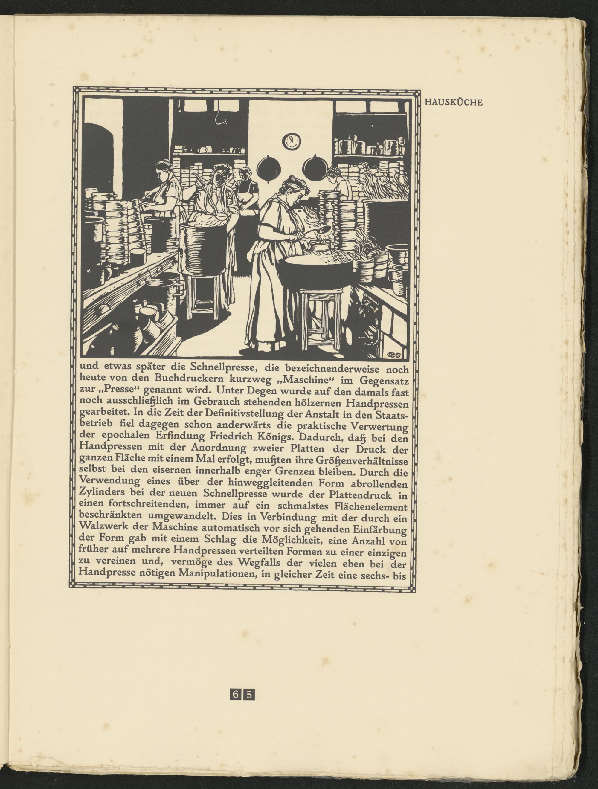 und etwas später die Schnellpresse, die bezeichnenderweise noch heute von den Buchdruckern kurzweg „Maschine“ im Gegensatz zur „Presse“ genannt wird* Unter Degen wurde auf den damals fast noch ausschließlich im Gebrauch stehenden hölzernen Handpressen gearbeitet* In die Zeit der Definitivstellung der Anstalt in den Staatsbetrieb fiel dagegen schon anderwärts die praktische Verwertung der epochalen Erfindung Friedrich Königs* Dadurch, daß bei den Handpressen mit der Anordnung zweier Platten der Druck der ganzen Fläche mit einem Mal erfolgt, mußten ihre Größenverhältnisse selbst bei den eisernen innerhalb enger Grenzen bleiben* Durch die Verwendung eines über der hinweggleitenden Form abrollenden Zylinders bei der neuen Schnellpresse wurde der Plattendruck in einen fortschreitenden, immer auf ein schmälstes Flächenelement beschränkten umgewandelt. Dies in Verbindung mit der durch ein Walzwerk der Maschine automatisch vor sich gehenden Einfärbung der Form gab mit einem Schlag die Möglichkeit, eine Anzahl von früher auf mehrere Handpressen verteilten Formen zu einer einzigen zu vereinen und, vermöge des Wegfalls der vielen eben bei der Handpresse nötigen Manipulationen, in gleicher Zeit eine sechs- bis