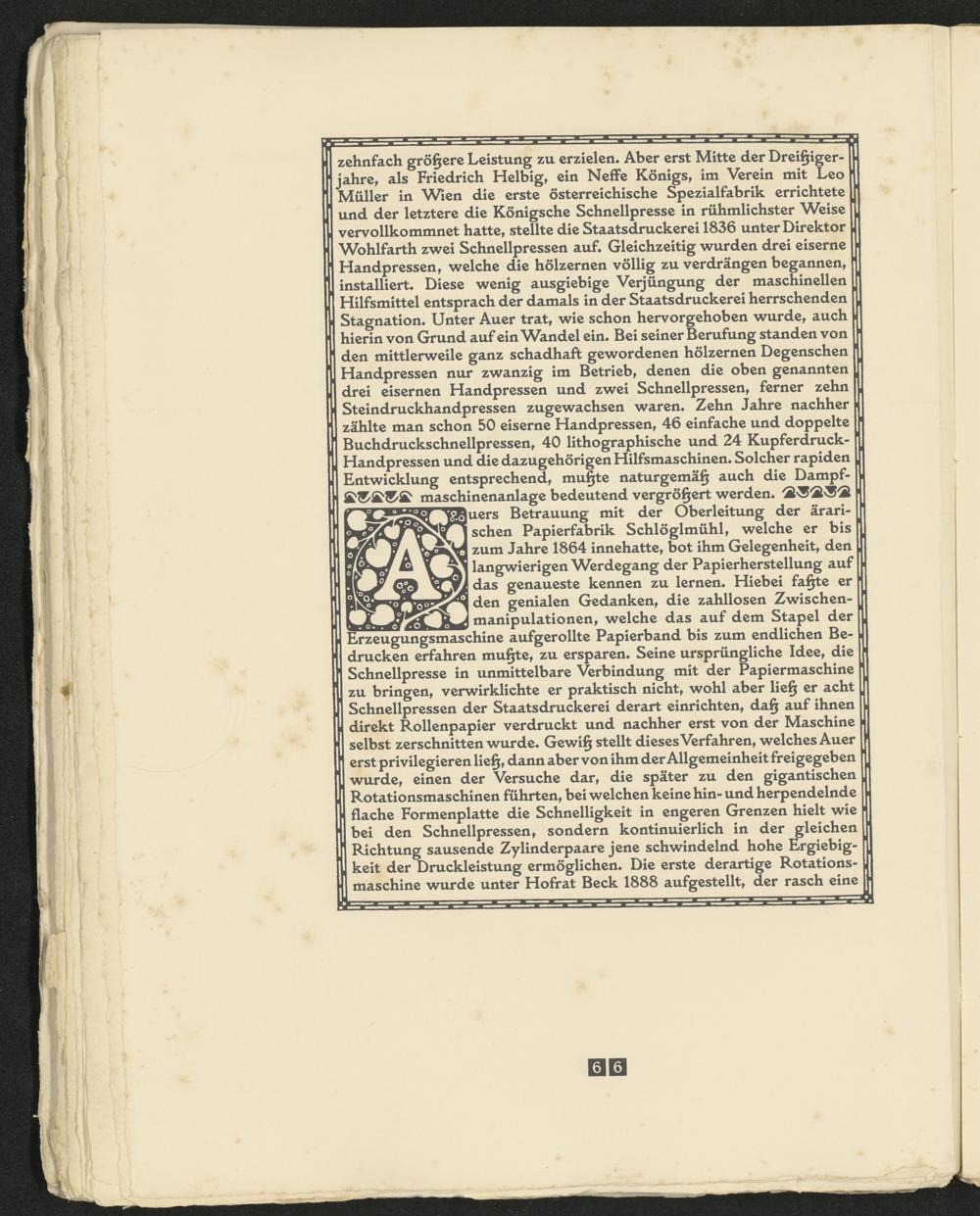 uers Betrauung mit der Oberleitung der ärarischen Papierfabrik Schlöglmühl, welche er bis zum Jahre 1864 innehatte, bot ihm Gelegenheit, den langwierigen Werdegang der Papierherstellung auf das genaueste kennen zu lernen* Hiebei faßte er den genialen Gedanken, die zahllosen Zwischenmanipulationen, welche das auf dem Stapel der Erzeugungsmaschine aufgerollte Papierband bis zum endlichen Bedrucken erfahren mußte, zu ersparen. Seine ursprüngliche Idee, die Schnellpresse in unmittelbare Verbindung mit der Papiermaschine zu bringen, verwirklichte er praktisch nicht, wohl aber ließ er acht Schnellpressen der Staatsdruckerei derart einrichten, daß auf ihnen direkt Rollenpapier verdruckt und nachher erst von der Maschine selbst zerschnitten wurde* Gewiß stellt dieses Verfahren, welches Auer erst privilegieren ließ, dann aber von ihm der Allgemeinheit freigegeben wurde, einen der Versuche dar, die später zu den gigantischen Rotationsmaschinen führten, bei welchen keine hin- und herpendelnde flache Formenplatte die Schnelligkeit in engeren Grenzen hielt wie bei den Schnellpressen, sondern kontinuierlich in der gleichen Richtung sausende Zylinderpaare jene schwindelnd hohe Ergiebigkeit der Druckleistung ermöglichen* Die erste derartige Rotationsmaschine wurde unter Hofrat Beck 1888 aufgestellt, der rasch eine