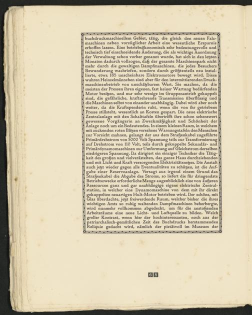 buchdruckmaschinellem Gebiet, tätig, die gleich den neuen Falzmaschinen neben vorzüglicher Arbeit eine wesentliche Ersparnis erhoffen lassen» Eine betriebsökonomisch sehr bedeutungsvolle und technisch tief einschneidende Änderung, die als wichtige Anordnung der Verwaltung schon vorher genannt wurde, hat sich in den letzten Monaten dadurch vollzogen, daß der gesamte Maschinenpark nicht mehr durch die gewaltigen Dampfmaschinen, die jedes Besuchers Bewunderung wachriefen, sondern durch größtenteils neu installierte, etwa 165 unscheinbare Elektromotore bewegt wird» Diese wahren Heinzelmännchen sind aber für den intermittierenden Druckmaschinenbetrieb von unschä^barem Wert» Sie machen, da die meisten der Pressen ihren eigenen, fast keiner Wartung bedürfenden Motor besißen, und nur sehr wenige im Gruppenantrieb gekuppelt sind, die gefährliche, kraftzehrende Transmission überflüssig und die Maschinen selbst von einander unabhängig» Dabei wird aber noch weiter, da die Kraftspenderin ruht, wenn die von ihr getriebene Presse stillsteht, wesentlich an Kosten gespart» Die neue elektrische Zentralanlage mit den Schalttafeln übertrifft ihre schon sehenswert gewesene Vorgängerin an Zweckmäßigkeit und Schönheit der Anlage noch um ein Bedeutendes» In einem kleinen Raum, in welchem mit zuckenden roten Blißen versehene Warnungstafeln den Menschen zur Vorsicht mahnen, gelangt der aus dem Straßenkabel zugeführte Primärdrehstrom von 5000 Volt Spannung teils zur Transformierung auf Drehstrom von 110 Volt, teils durch gekuppelte Sekundär- und Primärdynamomaschinen zur Umformung auf Gleichstrom derselben niedrigeren Spannung» Da dirigiert ein einziger Techniker die Tätigkeit des großen und vielverästelten, das ganze Haus durchziehenden und mit Licht und Kraft versorgenden Elektrizitätsneßes» Die Anstalt auch jeßt wieder gegen alle Eventualitäten zu schüfen, ist die Aufgabe einer Reserveanlage* Versagt aus irgend einem Grund das Straßenkabel die Abgabe des Stroms, so liefert die für dringendste Betriebszwecke erforderliche Menge augenblicklich eine von äußeren Ressourcen ganz und gar unabhängige eigene elektrische Zentralstation, in welcher eine Dynamomaschine von dem mit ihr direkt gekuppelten neuartigen Hult-Motor betrieben wird» Der schöne, mit Glas überdachte, jeßt freiwerdende Raum, welcher bisher die ihres wichtigen Amts so ruhig waltenden Dampfmaschinen beherbergte, wird nunmehr vollkommen abgedeckt, um für die anstoßenden Arbeitsräume eine neue Licht- und Luftquelle zu bilden» Welch greller Kontrast, wenn hier der hochinteressanten, noch aus der patriarchalisch-gemütlichen Zeit des Buchdrucks herstammenden Reliquie gedacht wird, nämlich der pietätvoll im Museum der