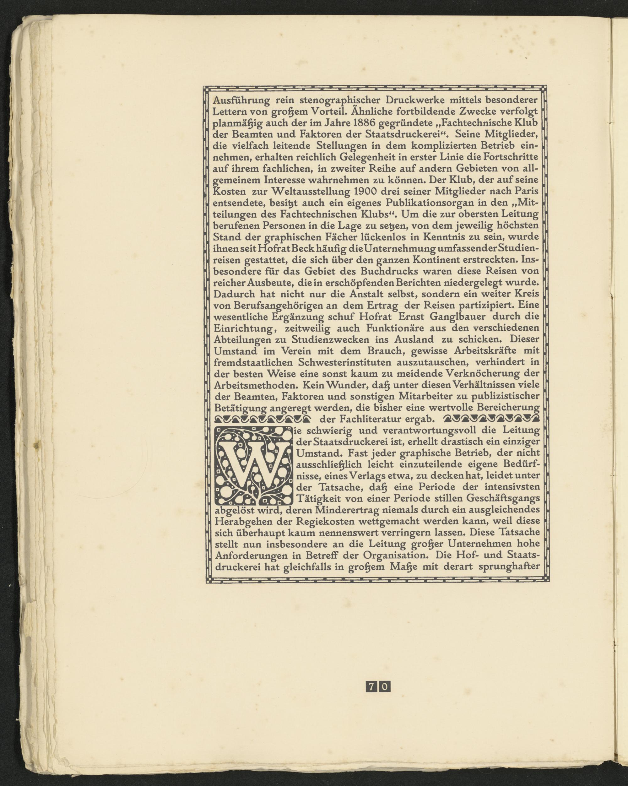 Ausführung rein stenographischer Druckwerke mittels besonderer Lettern von großem Vorteil* Ähnliche fortbildende Zwecke verfolgt planmäßig auch der im Jahre 1886 gegründete „Fachtechnische Klub der Beamten und Faktoren der Staatsdruckerei“* Seine Mitglieder, die vielfach leitende Stellungen in dem komplizierten Betrieb einnehmen, erhalten reichlich Gelegenheit in erster Linie die Fortschritte auf ihrem fachlichen, in zweiter Reihe auf andern Gebieten von allgemeinem Interesse wahrnehmen zu können* Der Klub, der auf seine Kosten zur Weltausstellung 1900 drei seiner Mitglieder nach Paris entsendete, besitzt auch ein eigenes Publikationsorgan in den „Mitteilungen des Fachtechnischen Klubs“* Um die zur obersten Leitung berufenen Personen in die Lage zu setzen, von dem jeweilig höchsten Stand der graphischen Fächer lückenlos in Kenntnis zu sein, wurde ihnen seit Hofrat Beck häufig die Unternehmung umfassender Studienreisen gestattet, die sich über den ganzen Kontinent erstreckten* Insbesondere für das Gebiet des Buchdrucks waren diese Reisen von reicher Ausbeute, die in erschöpfenden Berichten niedergelegt wurde* Dadurch hat nicht nur die Anstalt selbst, sondern ein weiter Kreis von Berufsangehörigen an dem Ertrag der Reisen partizipiert* Eine wesentliche Ergänzung schuf Hofrat Ernst Ganglbauer durch die Einrichtung, zeitweilig auch Funktionäre aus den verschiedenen Abteilungen zu Studienzwecken ins Ausland zu schicken* Dieser Umstand im Verein mit dem Brauch, gewisse Arbeitskräfte mit fremdstaatlichen Schwesterinstituten auszutauschen, verhindert in der besten Weise eine sonst kaum zu meidende Verknöcherung der Arbeitsmethoden* Kein Wunder, daß unter diesen Verhältnissen viele der Beamten, Faktoren und sonstigen Mitarbeiter zu publizistischer Betätigung angeregt werden, die bisher eine wertvolle Bereicherung