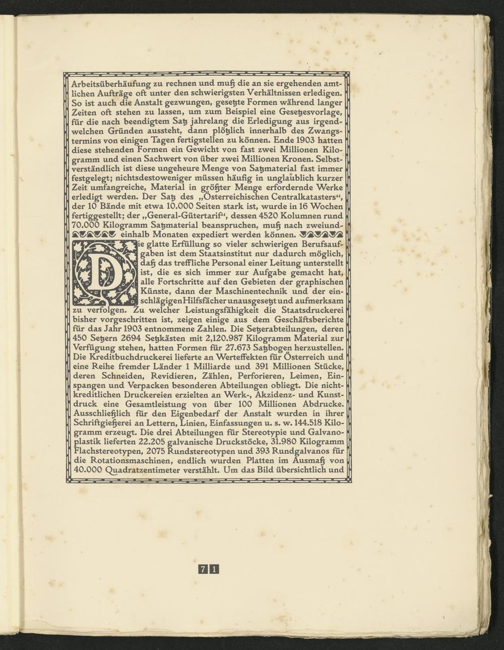 zu verfolgen* Zu welcher Leistungsfähigkeit die Staatsdruckerei bisher vorgeschritten ist, zeigen einige aus dem Geschäftsberichte für das Jahr 1903 entnommene Zahlen» Die Setzerabteilungen, deren 450 Setzern 2694 Setzkästen mit 2,120*987 Kilogramm Material zur Verfügung stehen, hatten Formen für 27*673 Satzbogen herzustellen» Die Kreditbuchdruckerei lieferte an Werteffekten für Österreich und eine Reihe fremder Länder 1 Milliarde und 391 Millionen Stücke, deren Schneiden, Revidieren, Zählen, Perforieren, Leimen, Einspangen und Verpacken besonderen Abteilungen obliegt» Die nicht- kreditlichen Druckereien erzielten an Werk-, Akzidenz- und Kunstdruck eine Gesamtleistung von über 100 Millionen Abdrucke» Ausschließlich für den Eigenbedarf der Anstalt wurden in ihrer Schriftgießerei an Lettern, Linien, Einfassungen u» s» w» 144»518 Kilogramm erzeugt* Die drei Abteilungen für Stereotypie und Galvanoplastik lieferten 22»205 galvanische Druckstöcke, 31*980 Kilogramm Flachstereotypen, 2075 Rundstereotypen und 393 Rundgalvanos für die Rotationsmaschinen, endlich wurden Platten im Ausmaß von 40*000 Quadratzentimeter verstählt» Um das Bild übersichtlich und