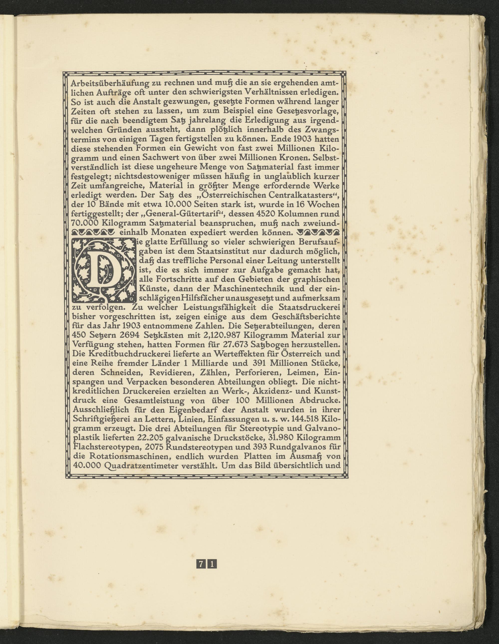 Arbeitsüberhäufung zu rechnen und muß die an sie ergehenden amtlichen Aufträge oft unter den schwierigsten Verhältnissen erledigen» So ist auch die Anstalt gezwungen, gesetzte Formen während langer Zeiten oft stehen zu lassen, um zum Beispiel eine Gesetzvorlage, für die nach beendigtem Satz jahrelang die Erledigung aus irgendwelchen Gründen aussteht, dann plötzlich innerhalb des Zwangstermins von einigen Tagen fertigstellen zu können» Ende 1903 hatten diese stehenden Formen ein Gewicht von fast zwei Millionen Kilogramm und einen Sachwert von über zwei Millionen Kronen» Selbstverständlich ist diese ungeheure Menge von Saßmaterial fast immer festgelegt; nichtsdestoweniger müssen häufig in unglaublich kurzer Zeit umfangreiche, Material in größter Menge erfordernde Werke erledigt werden» Der Saß des „Österreichischen Centralkatasters“, der 10 Bände mit etwa 10»000 Seiten stark ist, wurde in 16 Wochen fertiggestellt; der „General-Gütertarif“, dessen 4520 Kolumnen rund 70»000 Kilogramm Saßmaterial beanspruchen, muß nach zweiund- einhalb Monaten expediert werden können» ^S'SL^'SL^S'SL ^J ^ ie glatte Erfüllung so vieler schwierigen Berufsauf- K “ gaben ist dem Staatsinstitut nur dadurch möglich, daß das treffliche Personal einer Leitung unterstellt ist, die es sich immer zur Aufgabe gemacht hat, alle Fortschritte auf den Gebieten der graphischen Künste, dann der Maschinentechnik und der ein-