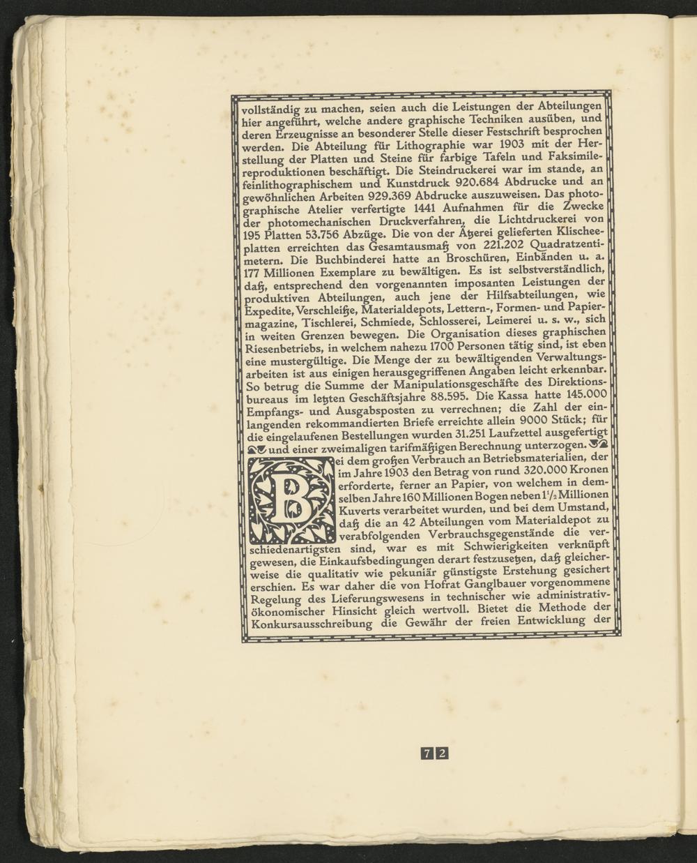 vollständig zu machen, seien auch die Leistungen der Abteilungen hier angeführt, welche andere graphische Techniken ausüben, und deren Erzeugnisse an besonderer Stelle dieser Festschrift besprochen werden* Die Abteilung für Lithographie war 1903 mit der Herstellung der Platten und Steine für farbige Tafeln und Faksimilereproduktionen beschäftigt« Die Steindruckerei war im stände, an feinlithographischem und Kunstdruck 920*684 Abdrucke und an gewöhnlichen Arbeiten 929*369 Abdrucke auszuweisen* Das photographische Atelier verfertigte 1441 Aufnahmen für die Zwecke der photomechanischen Druckverfahren^ die Lichtdruckerei von 195 Platten 53*756 Abzüge* Die von der Ätjerei gelieferten Klischeeplatten erreichten das Gesamtausmaß von 221*202 Quadratzentimetern* Die Buchbinderei hatte an Broschüren, Einbänden u« a« 177 Millionen Exemplare zu bewältigen* Es ist selbstverständlich, daß, entsprechend den vorgenannten imposanten Leistungen der produktiven Abteilungen, auch jene der Hilfsabteilungen, wie Expedite, Verschleiße, Materialdepots, Lettern-, Formen- und Papiermagazine, Tischlerei, Schmiede, Schlosserei, Leimerei u* s* w*, sich in weiten Grenzen bewegen* Die Organisation dieses graphischen Riesenbetriebs, in welchem nahezu 1700 Personen tätig sind, ist eben eine mustergültige* Die Menge der zu bewältigenden Verwaltungsarbeiten ist aus einigen herausgegriffenen Angaben leicht erkennbar* So betrug die Summe der Manipulationsgeschäfte des Direktionsbureaus im letzten Geschäftsjahre 88*595* Die Kassa hatte 145*000 Empfangs- und Ausgabsposten zu verrechnen; die Zahl der einlangenden rekommandierten Briefe erreichte allein 9000 Stück; für die eingelaufenen Bestellungen wurden 31*251 Laufzettel ausgefertigt £t&und einer zweimaligen tarifmäßigen Berechnung unterzogen*