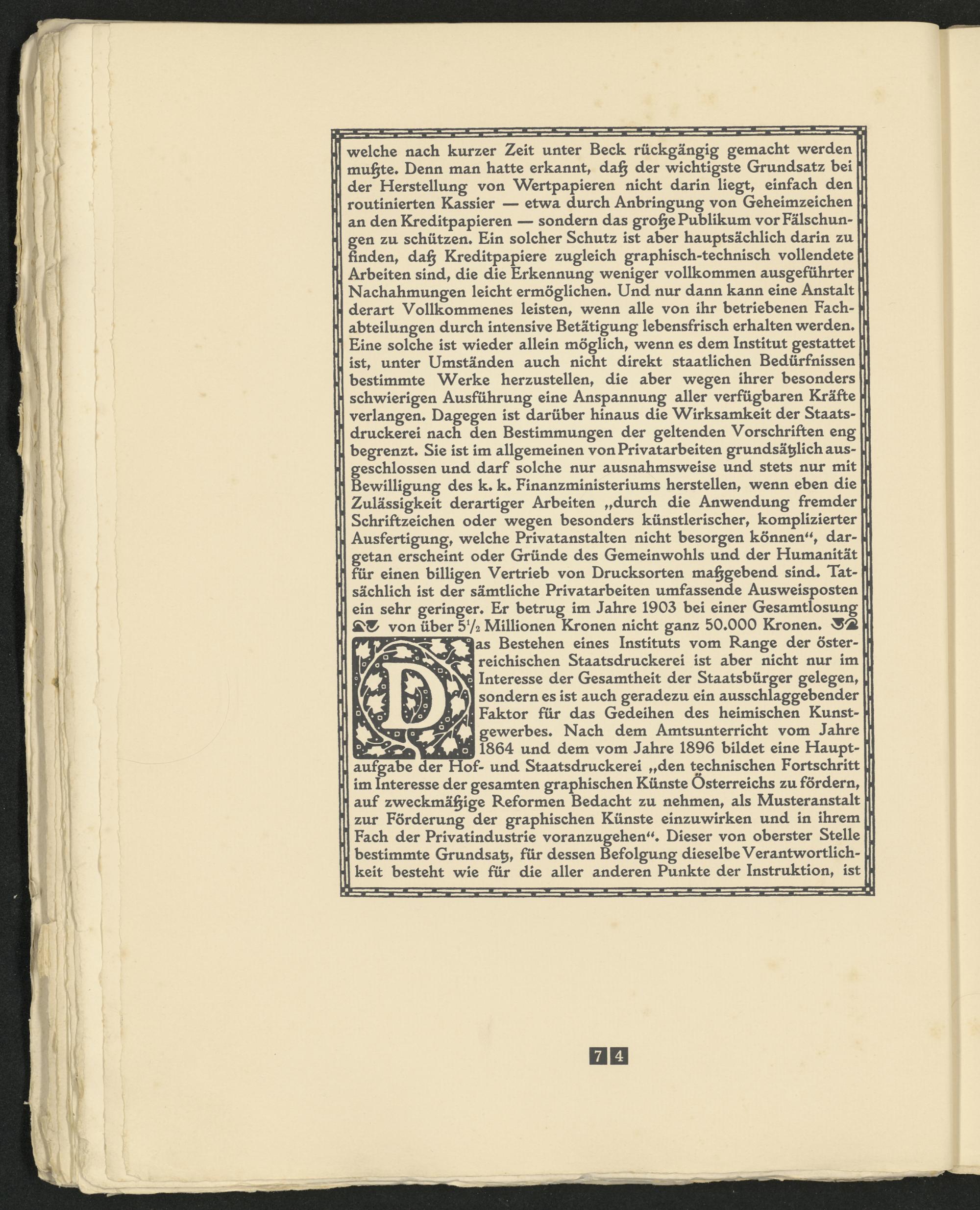 |as Bestehen eines Instituts vom Range der österreichischen Staatsdruckerei ist aber nicht nur im Interesse der Gesamtheit der Staatsbürger gelegen sondern es ist auch geradezu ein ausschlaggebender Faktor für das Gedeihen des heimischen Kunstgewerbes« Nach dem Amtsunterricht vom Jahre 1864 und dem vom Jahre 1896 bildet eine Hauptaufgabe der Hof- und Staatsdruckerei „den technischen Fortschritt im Interesse der gesamten graphischen Künste Österreichs zu fördern, auf zweckmäßige Reformen Bedacht zu nehmen, als Musteranstalt zur Förderung der graphischen Künste einzuwirken und in ihrem Fach der Privatindustrie voranzugehen“» Dieser von oberster Stelle bestimmte Grundsatz, für dessen Befolgung dieselbe Verantwortlichkeit besteht wie für die aller anderen Punkte der Instruktion, ist