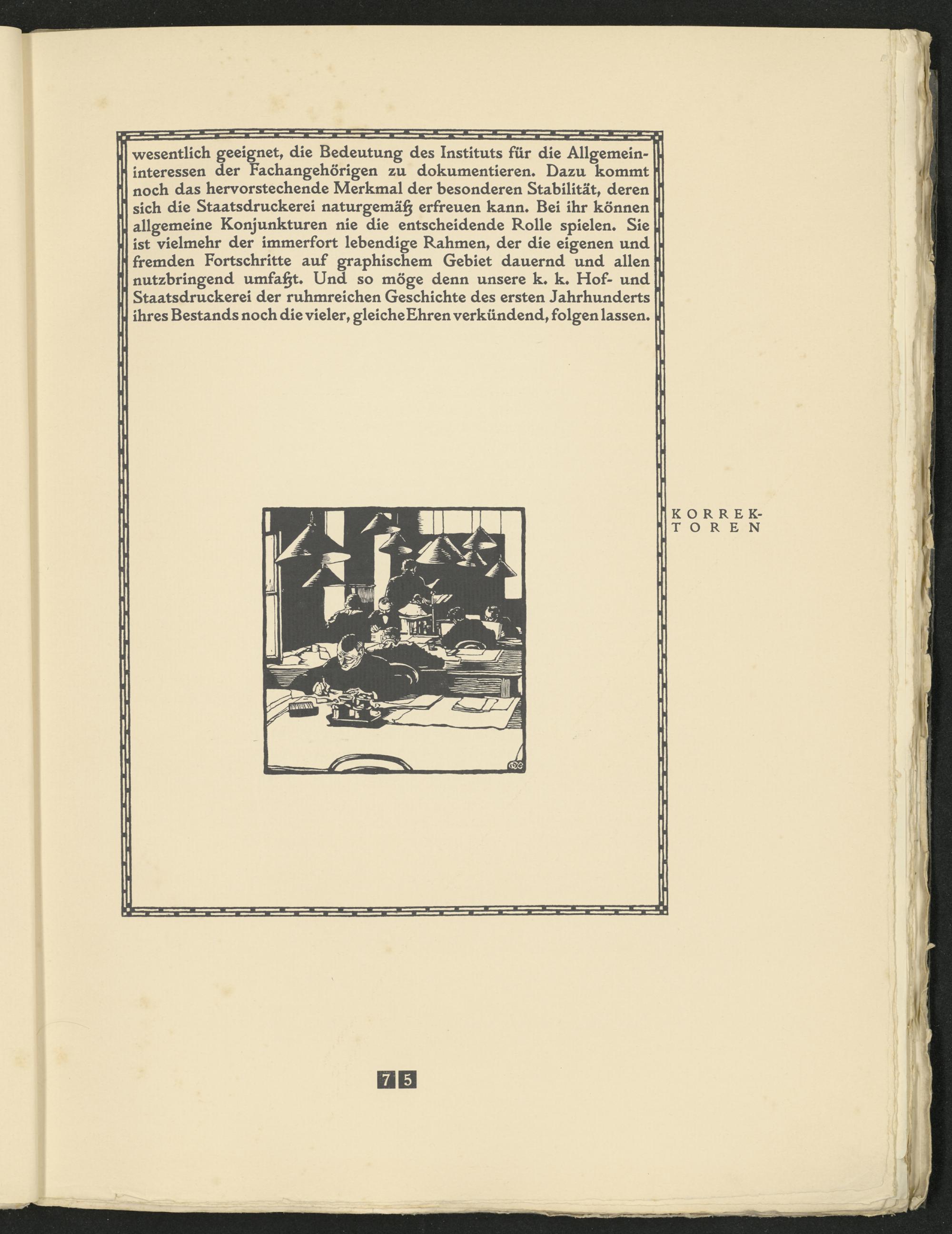 wesentlich geeignet, die Bedeutung des Instituts für die Allgemeininteressen der Fachangehörigen zu dokumentieren« Dazu kommt noch das hervorstechende Merkmal der besonderen Stabilität, deren sich die Staatsdruckerei naturgemäß erfreuen kann« Bei ihr können allgemeine Konjunkturen nie die entscheidende Rolle spielen« Sie ist vielmehr der immerfort lebendige Rahmen, der die eigenen und fremden Fortschritte auf graphischem Gebiet dauernd und allen nutzbringend umfaßt« Und so möge denn unsere k« k« Hof- und Staatsdruckerei der ruhmreichen Geschichte des ersten Jahrhunderts ihres Bestands noch die vieler, gleiche Ehren verkündend, folgen lassen«