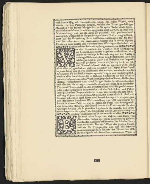 nicht allzu oft geschah es, daß ein Besucher die Treppe hinauf und in jenen Gang des oberen Geschosses sich verirrte, wo eine bis an die Kreuzgewölbe der Decke emporragende Gruppe von herrlichen Bildwerken alles dominierte: die in Rahmen beiderseits an den Wanden symmetrisch angeordneten Werke der graphischen Kunst, die Kupferplatten, Holzschnitte und druckfertigen Steine in Wandschränken und Vitrinen, die naturgetreuen Abbildungen diverser Spezies aus dem Tier- und Pflanzenreich in den Fensternischen und die geschlossenen oder aufgeschlagenen Prachtwerke auf den Schränken und Pulten jener plastischen Gruppe vis-à-vis* Es war eine wohlgeordnete Schaustellung all jener vorzüglichen Arbeiten, mit denen die k* k*Hof- und Staatsdruckerei so viele Ehren und Auszeichnungen davongetragen, von der ersten Londoner Weltausstellung von 1851 angefangen bis herein in unsere Zeit* Es war in gefälliger Form zusammengestellt das lehrreiche Material, auf Grund dessen die Franzosen sie für eine würdige Rivalin „de la première imprimerie du monde, de l'imprimerie impériale française“, die Engländer sie für „the most complété printing establishment of the world“ erklärt*