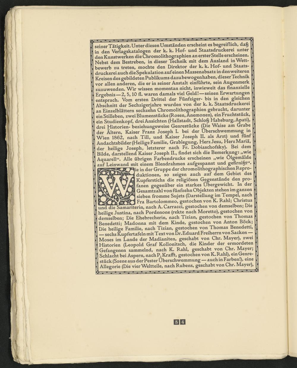 ie in der Gruppe der chromolithographischen Reproduktionen, so zeigen auch auf dem Gebiet des Kupferstichs die religiösen Gegenstände den profanen gegenüber ein starkes Übergewicht. In der Gesamtzahl von fünfzehn Objekten stehen im ganzen sieben fromme Sujets (Darstellung im Tempel, nach Fra Bartolommeo, gestochen von K. Rahl; Christus und die Samariterin, nach A. Carracci, gestochen von demselben; Die heilige Justina, nach Pordenone (rekte nach Moretto), gestochen von demselben; Die Ehebrecherin, nach Tizian, gestochen von Thomas Benedetti; Madonna mit dem Kinde, gestochen von Anton Bock; Die heilige Familie, nach Tizian, gestochen von Thomas Benedetti, — sechs Kupfertafeln mit Text von Dr. Eduard Freiherrn von Sacken — Moses im Lande der Madianiten, geschabt von Chr. Mayer), zwei Historien (Leopold Graf Kollonitsch, die Kinder der ermordeten Gefangenen sammelnd, nach K. Rahl, geschabt von Chr. Mayer; Schlacht bei Aspern, nach P. Krafft, gestochen von K. Rahl), ein Genrestück (Szene aus der Pester Überschwemmung — auch in Farben!), eine Allegorie (Die vier Weltteile, nach Rubens, geschabt von Chr. Mayer)
