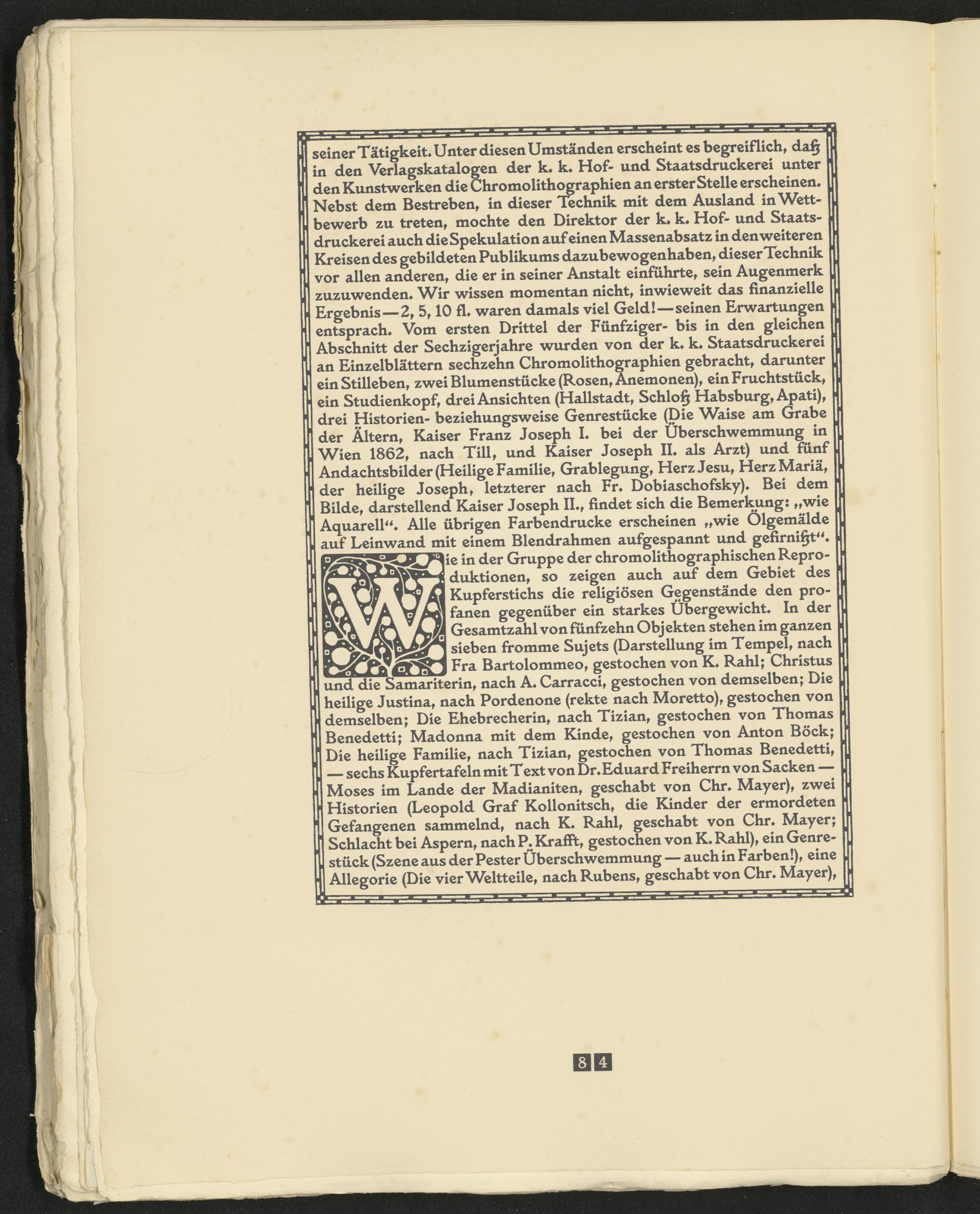 seiner Tätigkeit. Unter diesen Umständen erscheint es begreiflich dafj in den Verlagskatalogen der k. k. Hof- und Staatsdruckerei unter den Kunstwerken die Chromolithographien an erster Stelle erscheinen. Nebst dem Bestreben, in dieser Technik mit dem Ausland in Wettbewerb zu treten, mochte den Direktor der k. k. Hof- und Staatsdruckerei auch die Spekulation auf einen Massenabsatz in den weiteren Kreisen des gebildeten Publikums dazubewogenhaben, dieser Technik vor allen anderen, die er in seiner Anstalt einfiihrte, sein Augenmerk zuzuwenden. Wir wissen momentan nicht, inwieweit das finanzielle Ergebnis—2, 5,10 fl. waren damals viel Geld!—seinen Erwartungen entsprach. Vom ersten Drittel der Fünfziger- bis in den gleichen Abschnitt der Sechzigerjahre wurden von der k. k. Staatsdruckerei an Einzelblättern sechzehn Chromolithographien gebracht, darunter ein Stilleben, zwei Blumenstücke (Rosen, Anemonen), ein Fruchtstück, ein Studienkopf, drei Ansichten (Hallstadt, Schlofj Habsburg, Apati), drei Historien- beziehungsweise Genrestücke (Die Waise am Grabe der Ältern, Kaiser Franz Joseph I. bei der Überschwemmung in Wien 1862, nach Till, und Kaiser Joseph II. als Arzt) und fünf Andachtsbilder (Heilige Familie, Grablegung, Herz Jesu, Herz Mariä, der heilige Joseph, letzterer nach Fr. Dobiaschofsky). Bei dem Bilde, darstellend Kaiser Joseph II., findet sich die Bemerkung: „wie Aquarell“. Alle übrigen Farbendrucke erscheinen „wie Ölgemälde auf Leinwand mit einem Blendrahmen aufgespannt und gefirnißt“.