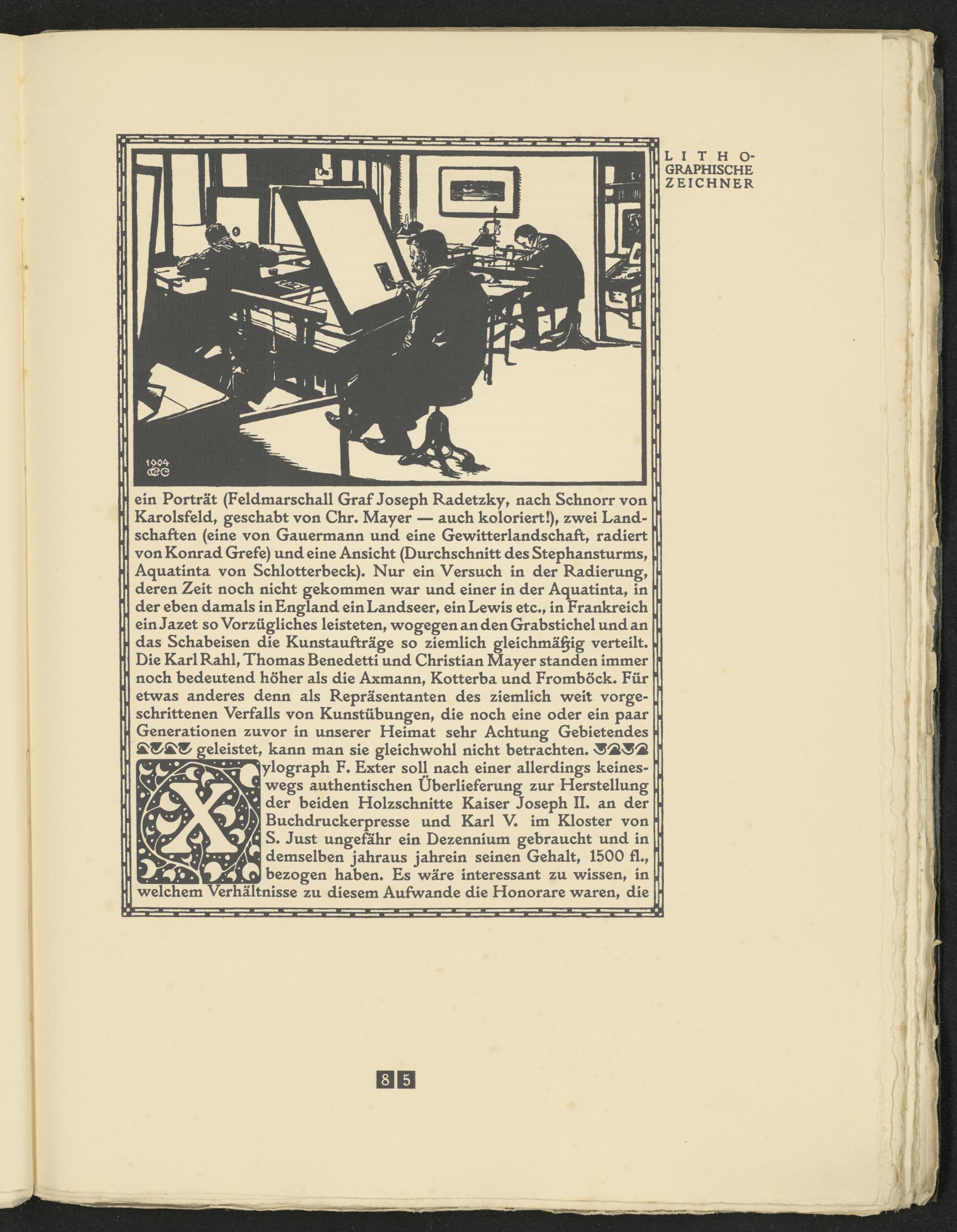 ein Porträt (Feldmarschall Graf Joseph Radetzky, nach Schnorr von Karolsfeld, geschabt von Chr* Mayer — auch koloriert!), zwei Landschaften (eine von Gauermann und eine Gewitterlandschaft, radiert von Konrad Grefe) und eine Ansicht (Durchschnitt des Stephansturms, Aquatinta von Schlotterbeck)* Nur ein Versuch in der Radierung, deren Zeit noch nicht gekommen war und einer in der Aquatinta, in der eben damals in England einLandseer, ein Lewis etc*, in Frankreich einJazet so Vorzügliches leisteten, wogegen an den Grabstichel und an das Schabeisen die Kunstaufträge so ziemlich gleichmäßig verteilt Die Karl Rahl, Thomas Benedetti und Christian Mayer standen immer noch bedeutend höher als die Axmann, Kotterba und Fromböck* Für etwas anderes denn als Repräsentanten des ziemlich weit vorgeschrittenen Verfalls von Kunstübungen, die noch eine oder ein paar Generationen zuvor in unserer Heimat sehr Achtung Gebietendes geleistet , kann man sie gleichwohl nicht betrachten* ; &'2L^ / 2L |ylograph F* Exter soll nach einer allerdings keineswegs authentischen Überlieferung zur Herstellung der beiden Holzschnitte Kaiser Joseph II. an der Buchdruckerpresse und Karl V. im Kloster von S. Just ungefähr ein Dezennium gebraucht und in demselben jahraus jahrein seinen Gehalt, 1500 fl*,