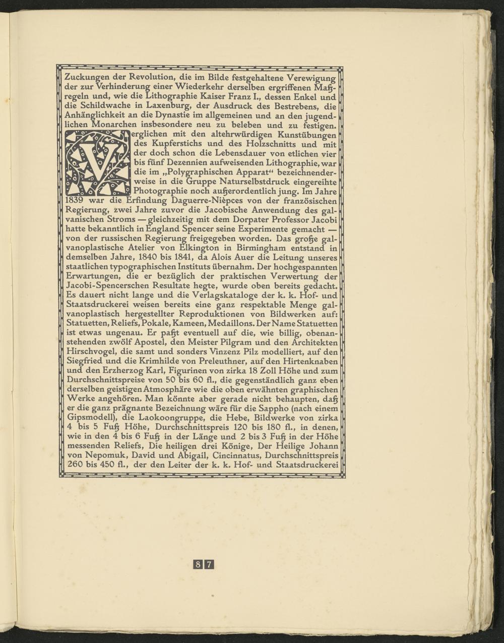 erglichen mit den altehrwürdigen Kunstübungen des Kupferstichs und des Holzschnitts und mit der doch schon die Lebensdauer von etlichen vier bis fünf Dezennien aufweisenden Lithographie, war die im „Polygraphischen Apparat“ bezeichnenderweise in die Gruppe Naturselbstdruck eingereihte Photographie noch außerordentlich jung. Im Jahre 1839 war die Erfindung Daguerre-Nifepces von der französischen Regierung, zwei Jahre zuvor die Jacobische Anwendung des galvanischen Stroms — gleichzeitig mit dem Dorpater Professor Jacobi hatte bekanntlich in England Spencer seine Experimente gemacht — von der russischen Regierung freigegeben worden. Das große galvanoplastische Atelier von Elkington in Birmingham entstand in demselben Jahre, 1840 bis 1841, da Alois Auer die Leitung unseres staatlichen typographischen Instituts übernahm. Der hochgespannten Erwartungen, die er bezüglich der praktischen Verwertung der Jacobi-Spencerschen Resultate hegte, wurde oben bereits gedacht. Es dauert nicht lange und die Verlagskataloge der k. k. Hof- und Staatsdruckerei weisen bereits eine ganz respektable Menge galvanoplastisch hergestellter Reproduktionen von Bildwerken auf: Statuetten, Reliefs, Pokale, Kameen, Medaillons. Der Name Statuetten ist etwas ungenau. Er paßt eventuell auf die, wie billig, obenanstehenden zwölf Apostel, den Meister Pilgram und den Architekten Hirschvogel, die samt und sonders Vinzenz Pilz modelliert, auf den Siegfried und die Krimhilde von Preleuthner, auf den Hirtenknaben und den Erzherzog Karl, Figurinen von zirka 18 Zoll Höhe und zum Durchschnittspreise von 50 bis 60 fl., die gegenständlich ganz eben derselben geistigen Atmosphäre wie die oben erwähnten graphischen Werke angehören. Man könnte aber gerade nicht behaupten, daß er die ganz prägnante Bezeichnung wäre für die Sappho (nach einem Gipsmodell), die Laokoongruppe, die Hebe, Bildwerke von zirka 4 bis 5 Fuß Höhe, Durchschnittspreis 120 bis 180 fl., in denen, wie in den 4 bis 6 Fuß in der Länge und 2 bis 3 Fuß in der Höhe messenden Reliefs, Die heiligen drei Könige, Der Heilige Johann von Nepomuk, David und Abigail, Cincinnatus, Durchschnittspreis 260 bis 450 fl., der den Leiter der k. k. Hof- und Staatsdruckerei