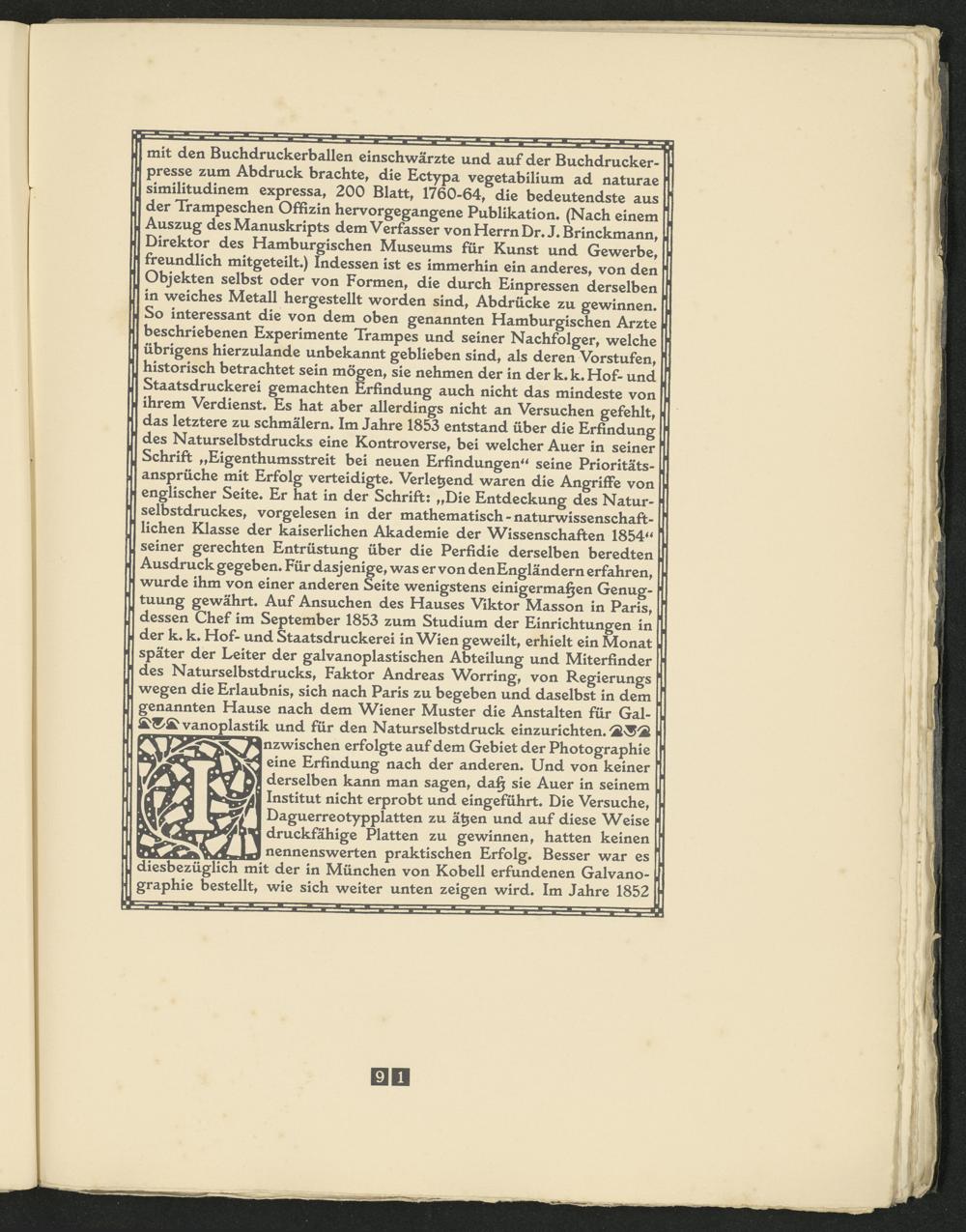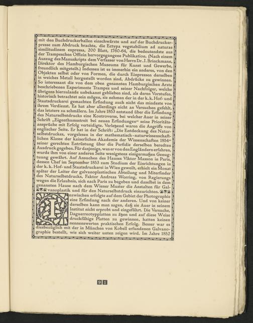 mit den Buchdruckerballen einschwärzte und auf der Buchdruckerpresse zum Abdruck brachte, die Ectypa vegetabilium ad naturae similitudinem expressa, 200 Blatt, 1760-64, die bedeutendste aus der Trampeschen Offizin hervorgegangene Publikation* (Nach einem Auszug des Manuskripts dem Verfasser von Herrn Dr.J.Brinckmann, Direktor des Hamburgischen Museums für Kunst und Gewerbe, freundlich mitgeteilt*) Indessen ist es immerhin ein anderes, von den Objekten selbst oder von Formen, die durch Einpressen derselben in weiches Metall hergestellt worden sind, Abdrücke zu gewinnen* So interessant die von dem oben genannten Hamburgischen Arzte beschriebenen Experimente Trampes und seiner Nachfolger, welche übrigens hierzulande unbekannt geblieben sind, als deren Vorstufen, historisch betrachtet sein mögen, sie nehmen der in der k* k* Hof- und Staatsdruckerei gemachten Erfindung auch nicht das mindeste von ihrem Verdienst* Es hat aber allerdings nicht an Versuchen gefehlt, das letztere zu schmälern* Im Jahre 1853 entstand über die Erfindung des Naturselbstdrucks eine Kontroverse, bei welcher Auer in seiner Schrift „Eigenthumsstreit bei neuen Erfindungen“ seine Prioritätsansprüche mit Erfolg verteidigte* Verletzend waren die Angriffe von englischer Seite* Er hat in der Schrift: „Die Entdeckung des Naturselbstdruckes, vorgelesen in der mathematisch - naturwissenschaftlichen Klasse der kaiserlichen Akademie der Wissenschaften 1854“ seiner gerechten Entrüstung über die Perfidie derselben beredten Ausdruck gegeben* Für dasjenige, was er von denEngländern erfahren, wurde ihm von einer anderen Seite wenigstens einigermaßen Genugtuung gewährt* Auf Ansuchen des Hauses Viktor Masson in Paris, dessen Chef im September 1853 zum Studium der Einrichtungen in der k* k* Hof- und Staatsdruckerei in Wien geweilt, erhielt ein Monat später der Leiter der galvanoplastischen Abteilung und Miterfinder des Natur selbstdrucks, Faktor Andreas Worring, von Regierungs wegen die Erlaubnis, sich nach Paris zu begeben und daselbst in dem genannten Hause nach dem Wiener Muster die Anstalten für Gal- vanoplastik und für den Naturselbstdruck einzurichten* 'SL^S'SL nzwischen erfolgte auf dem Gebiet der Photographie eine Erfindung nach der anderen* Und von keiner derselben kann man sagen, daß sie Auer in seinem Institut nicht erprobt und eingeführt* Die Versuche, Daguerreotypplatten zu ä^en und auf diese Weise druckfahige Platten zu gewinnen, hatten keinen nennenswerten praktischen Erfolg* Besser war es diesbezüglich mit der in München von Kobell erfundenen Galvano- graphie bestellt, wie sich weiter unten zeigen wird. Im Jahre 1852
