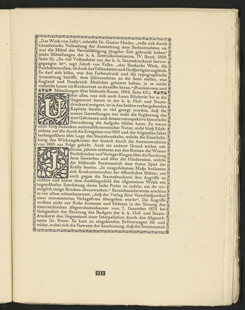 eber alles, was sich nach Auers Rücktritt bis in die Gegenwart herein in der k. k. Hof- und Staatsdruckerei ereignet, ist in den beiden vorhergehenden Kapiteln bereits so viel gesagt worden, daß für unsere Darstellungen nur mehr die Ergänzung des dort Gebotenen und dessen retrospektive historische Betrachtung die Aufgabe bilden kann. Es waren nicht bloß Bedenken nationalökonomischer Natur, nicht bloß Rücksichten auf die durch die Ereignisse von 1859 und der folgenden Jahre herbeigeführte üble Lage des Staatshaushalts, welche die Einschränkung des Wirkungskreises der Anstalt durch die Amtsinstruktion von 1865 zur Folge gehabt. Auch ein anderer Grund wirkte mit.