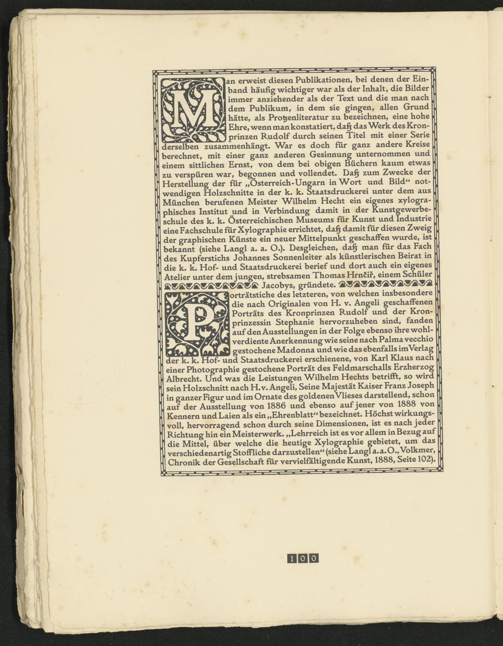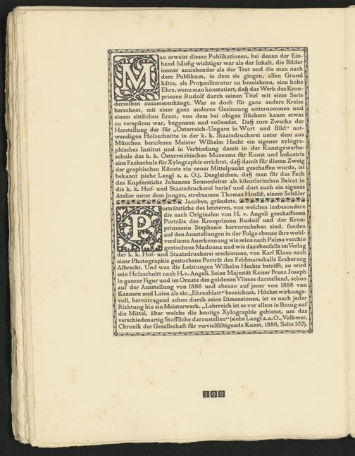 an erweist diesen Publikationen, bei denen der Einband häufig wichtiger war als der Inhalt, die Bilder immer anziehender als der Text und die man nach dem Publikum, in dem sie gingen, allen Grund hätte, als Protjenliteratur zu bezeichnen, eine hohe Ehre, wenn man konstatiert, da§ das Werk des Kronprinzen Rudolf durch seinen Titel mit einer Serie derselben zusammenhängt* War es doch für ganz andere Kreise berechnet, mit einer ganz anderen Gesinnung unternommen und einem sittlichen Ernst, von dem bei obigen Büchern kaum etwas zu verspüren war, begonnen und vollendet. Da§ zum Zwecke der Herstellung der für „Österreich-Ungarn in Wort und Bild“ notwendigen Holzschnitte in der k. k. Staatsdruckerei unter dem aus München berufenen Meister Wilhelm Hecht ein eigenes xylogra- phisches Institut „und in Verbindung damit in der Kunstgewerbeschule des k. k. Österreichischen Museums für Kunst und Industrie eine Fachschule für Xylographie errichtet, da§ damit für diesen Zweig der graphischen Künste ein neuer Mittelpunkt geschaffen wurde, ist bekannt (siehe Langl a. a. O.). Desgleichen, da§ man für das Fach des Kupferstichs Johannes Sonnenleiter als künstlerischen Beirat in die k. k. Hof- und Staatsdruckerei berief und dort auch ein eigenes Atelier unter dem jungen, strebsamen Thomas Hrn5ir, einem Schüler