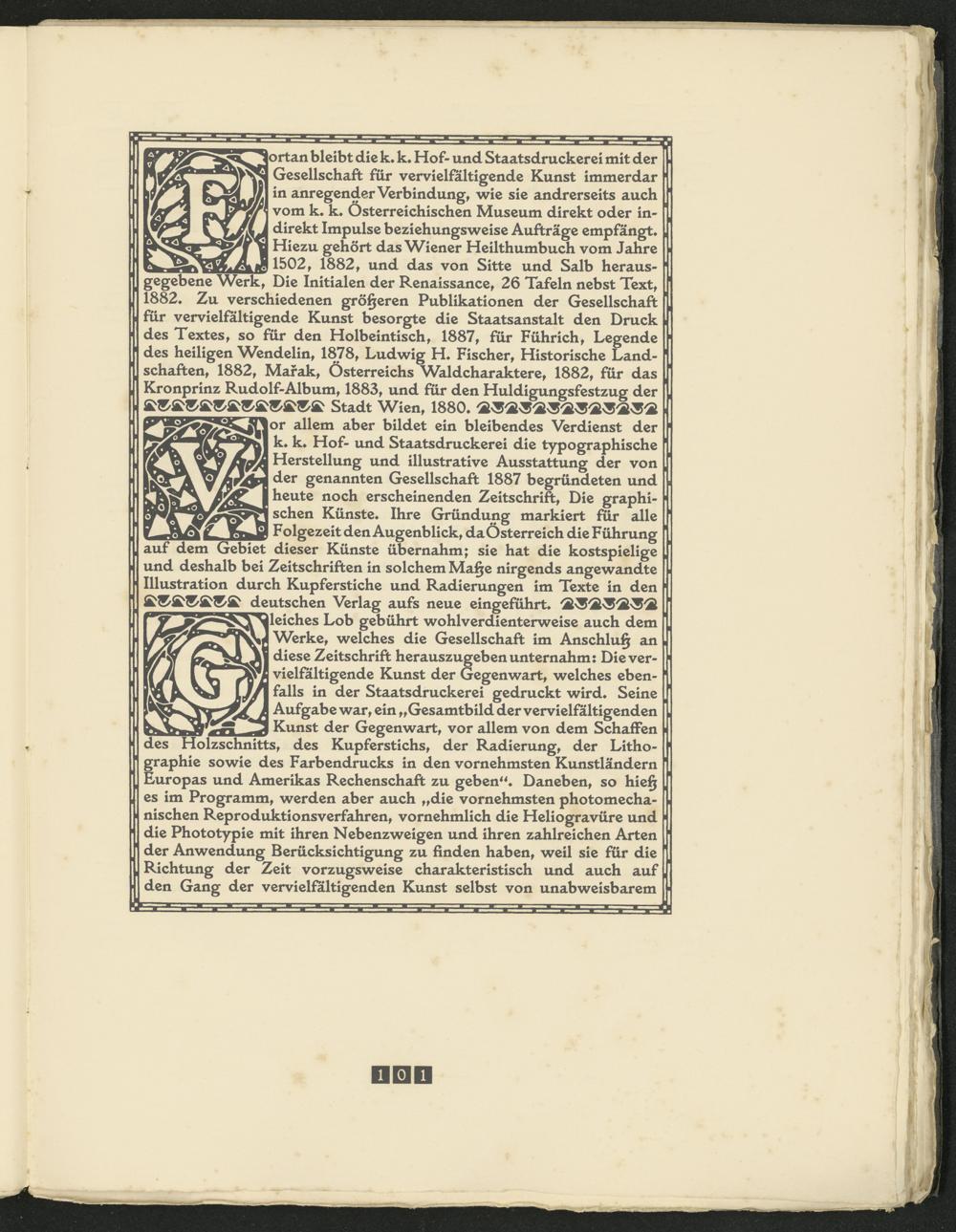 or allem aber bildet ein bleibendes Verdienst der k* k* Hof- und Staatsdruckerei die typographische Herstellung und illustrative Ausstattung der von der genannten Gesellschaft 1887 begründeten und heute noch erscheinenden Zeitschrift, Die graphischen Künste* Ihre Gründung markiert für alle