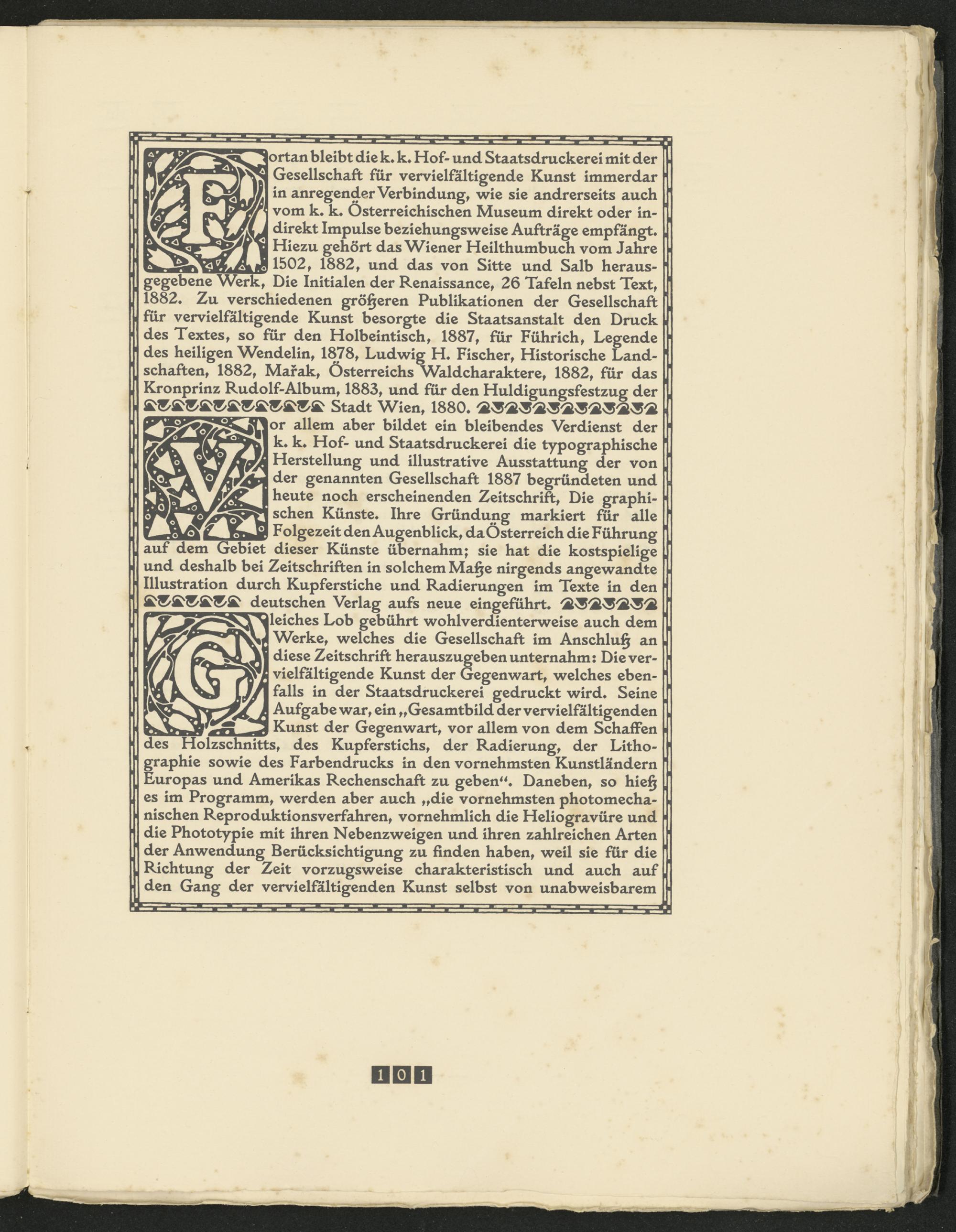 fortan bleibt die k* k* Hof- und Staatsdruckerei mit der Gesellschaft für vervielfältigende Kunst immerdar in anregender Verbindung, wie sie andrerseits auch vom k* k* Österreichischen Museum direkt oder indirekt Impulse beziehungsweise Aufträge empfängt* Hiezu gehört das Wiener Heilthumbuch vom Jahre _ 1502 , 1882, und das von Sitte und Salb herausgegebene Werk, Die Initialen der Renaissance, 26 Tafeln nebst Text, 1882* Zu verschiedenen größeren Publikationen der Gesellschaft für vervielfältigende Kunst besorgte die Staatsanstalt den Druck des Textes, so für den Holbeintisch, 1887, für Führich, Legende des heiligen Wendelin, 1878, Ludwig H* Fischer, Historische Landschaften, 1882, Marak, Österreichs Waldcharaktere, 1882, für das Kronprinz Rudolf-Album, 1883, und für den Huldigungsfestzug der &&&&&&&&&&&&& Stadt Wien, 1880*