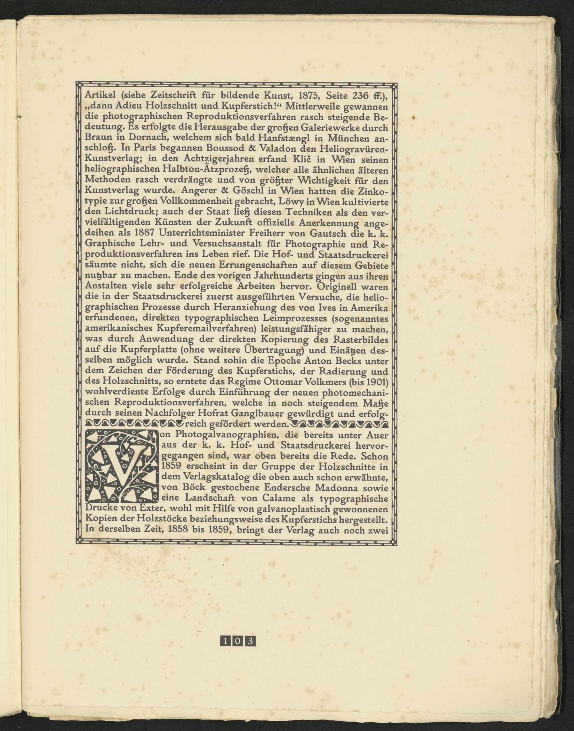 Artikel (siehe Zeitschrift für bildende Kunst, 1875, Seite 236 ff*), „dann Adieu Holzschnitt und Kupferstich!“ Mittlerweile gewannen die photographischen Reproduktionsverfahren rasch steigende Bedeutung* Es erfolgte die Herausgabe der gro§en Galeriewerke durch Braun in Dörnach, welchem sich bald Hanfstasngl in München an- schlofj* In Paris begannen Boussod & Valadon den Heliogravüren- Kunstverlag; in den Achtzigerjahren erfand Klic in Wien seinen heliographischen Halbton-Atzprozefj, welcher alle ähnlichen älteren Methoden rasch verdrängte und von größter Wichtigkeit für den Kunstverlag wurde* Angerer & Göschl in Wien hatten die Zinko- typie zur großen Vollkommenheit gebracht, Löwy inWien kultivierte den Lichtdruck; auch der Staat lie§ diesen Techniken als den vervielfältigenden Künsten der Zukunft offizielle Anerkennung angedeihen als 1887 Unterrichtsminister Freiherr von Gautsch die k* k* Graphische Lehr- und Versuchsanstalt für Photographie und Reproduktionsverfahren ins Leben rief* Die Hof- und Staatsdruckerei säumte nicht, sich die neuen Errungenschaften auf diesem Gebiete nutzbar zu machen* Ende des vorigen Jahrhunderts gingen aus ihren Anstalten viele sehr erfolgreiche Arbeiten hervor. Originell waren die in der Staatsdruckerei zuerst ausgeführten Versuche, die heliographischen Prozesse durch Heranziehung des von Ives in Amerika erfundenen, direkten typographischen Leimprozesses (sogenanntes amerikanisches Kupferemailverfahren) leistungsfähiger zu machen, was durch Anwendung der direkten Kopierung des Rasterbildes auf die Kupferplatte (ohne weitere Übertragung) und Einät$en desselben möglich wurde* Stand sohin die Epoche Anton Becks unter dem Zeichen der Förderung des Kupferstichs, der Radierung und des Holzschnitts, so erntete das Regime Ottomar Volkmers (bis 1901) wohlverdiente Erfolge durch Einführung der neuen photomechanischen Reproduktionsverfahren, welche in noch steigendem Ma^e durch seinen Nachfolger Hofrat Ganglbauer gewürdigt und erfolg- £&£S/£7£1&£&£9/ reich gefördert werden.