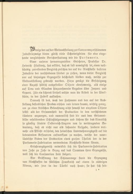 Einer unserer hervorragendsten Gelehrten, Professor Dr. Heinrich Hlasiwetz, hat erklärt, daß es fast unmöglich sei, einen vollständig zutreffenden Vergleich zwischen der auf die Riechstoffe basirten Industrie der verschiedenen Länder zu ziehen, wenn dieser Vergleich nur auf diejenigen Erzeugnisse beschränkt bleiben muß, welche zur Weltausstellung gebracht wurden. Hiezu genügt die Besichtigung einer Anzahl hübsch ausgestellter Objecte ebensowenig, als einige auf Treu und Glauben hinzunehmende Angaben über Import und Export. Für ein sicheres Urtheil müßte man die Arbeit in der Werkstätte, in der Fabrik aufsuchen.