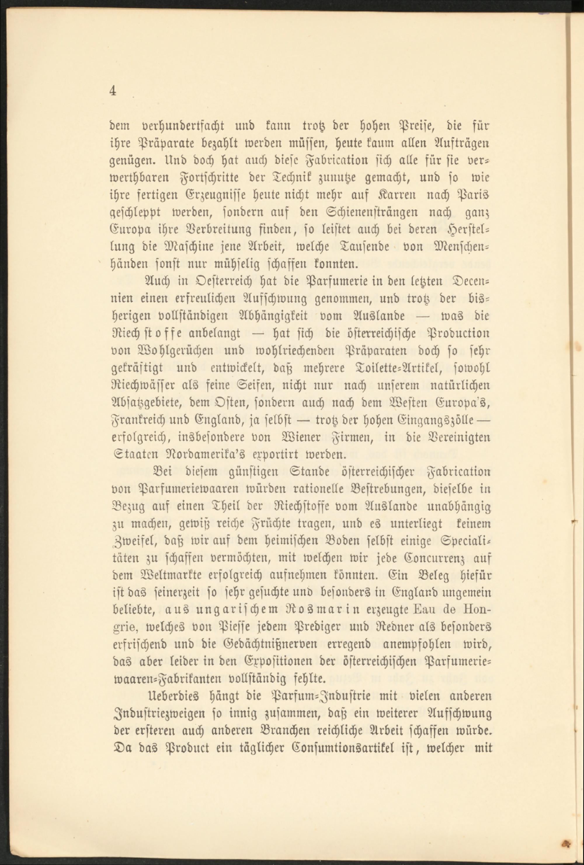 Auch in Oesterreich hat die Parfumerie in den letzten Decen- nien einen erfreulichen Aufschwung genommen, und trotz der bisherigen vollständigen Abhängigkeit vom Auslande — was die Riechstoffe anbelangt — hat sich die österreichische Production von Wohlgerüchen und wohlriechenden Präparaten doch so sehr gekräftigt und entwickelt, daß mehrere Toilette-Artikel, sowohl Riechwässer als feine Seifen, nicht nur nach unserem natürlichen Absatzgebiete, dem Osten, sondern auch nach dem Westen Europa s, Frankreich und England, ja selbst — trotz der hohen Eingangszölle — erfolgreich, insbesondere von Wiener Firmen, in die Vereinigten Staaten Nordamerikas exportirt werden.