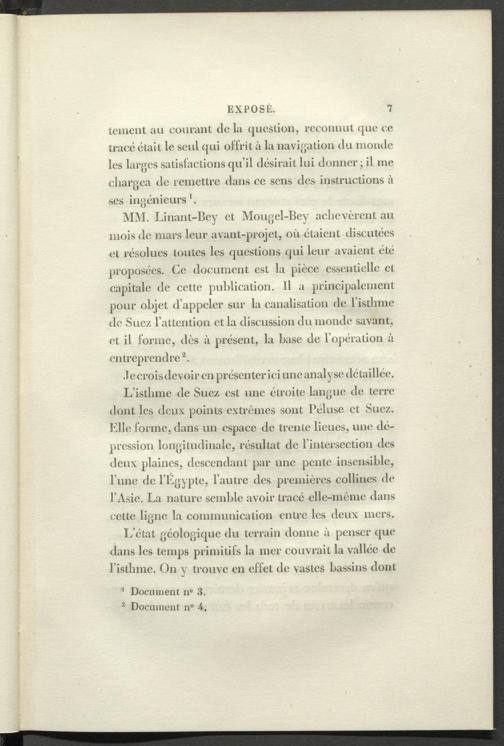 MM. Linant-licy et Mougcl-Bey achevèrent au mois de mars leur avant-projet, où étaient discutées et résolues toutes les questions qui leur avaient été proposées. Ce document est la pièce essentielle et capitale de cette publication. Il a principalement pour objet d’appeler sur la canalisation de l’isthme de Suez l’attention et la discussion du monde savant, et il forme, dès à présent, la base de l’opération à entreprendre 2 .