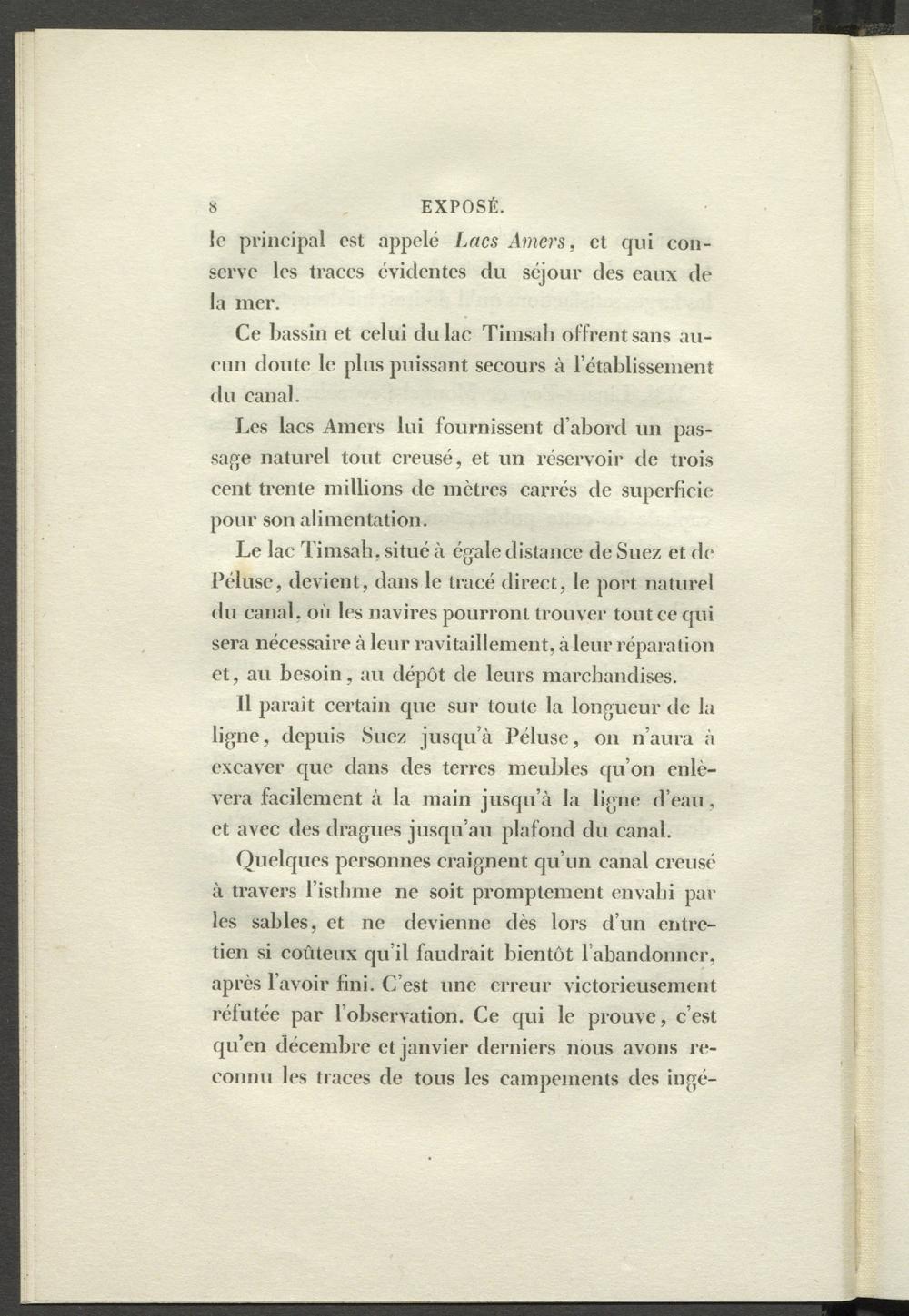 Le lac Timsali, situé à égale distance de Suez et de Péluse, devient, dans le tracé direct, le port naturel du canal, où les navires pourront trouver tout ce qui sera nécessaire à leur ravitaillement, à leur réparation et, au besoin, au dépôt de leurs marchandises.