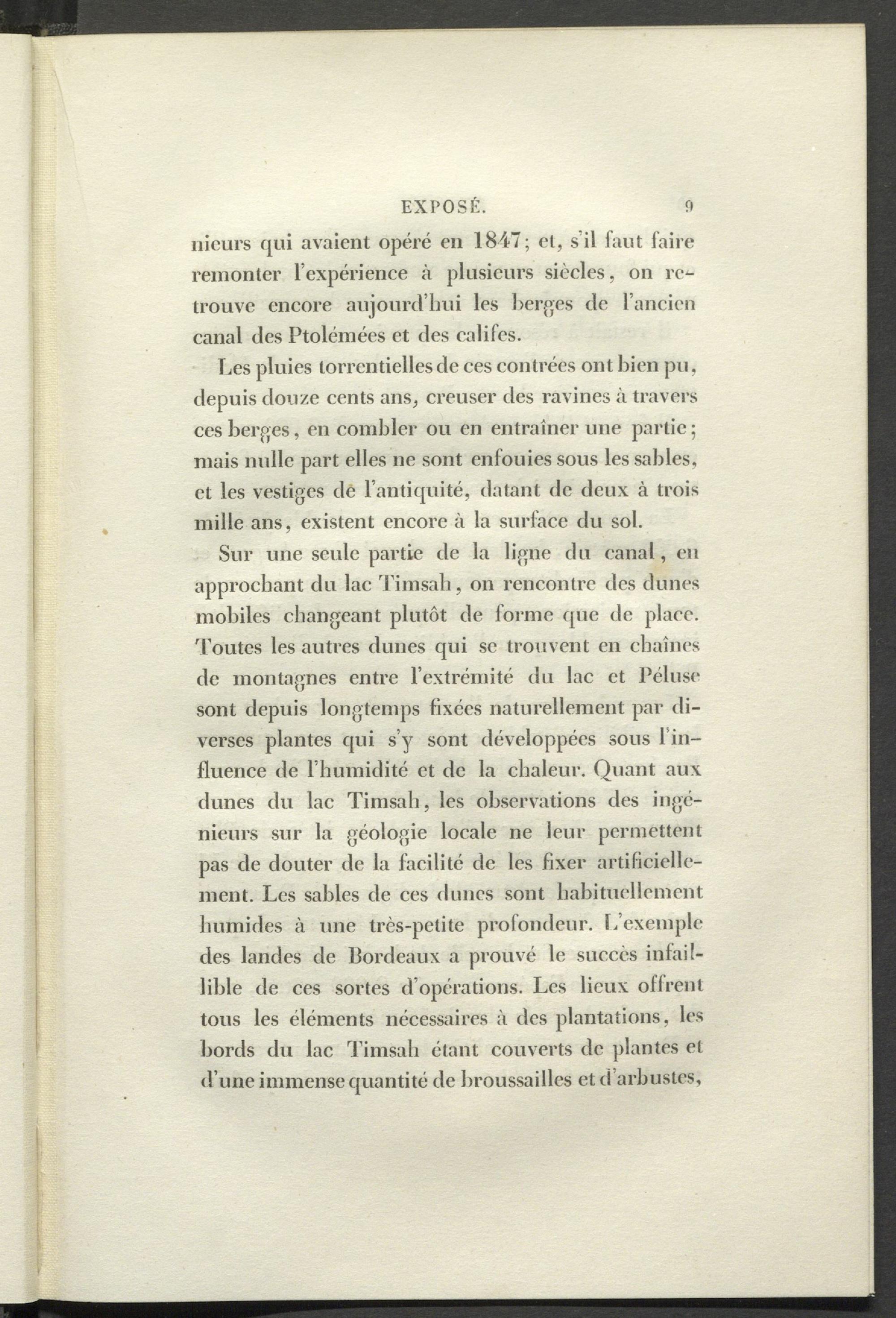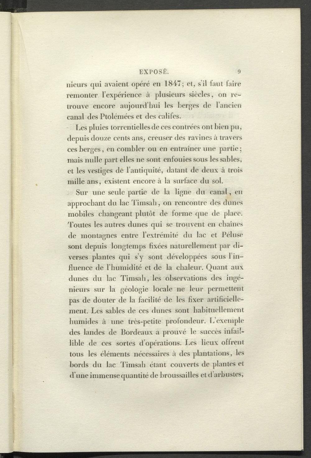 Sur une seule partie de la ligne du canal, en approchant du lac Timsah, on rencontre des dunes mobiles changeant plutôt de forme que de place, 'boutes les autres dunes qui se trouvent en chaînes de montagnes entre l’extrémité du lac et Péluse sont depuis longtemps fixées naturellement par diverses plantes qui s’y sont développées sous l’influence de l’humidité et de la chaleur. Quant aux dunes du lac Timsah, les observations des ingénieurs sur la géologie locale ne leur permettent pas de douter de la facilité de les fixer artificiellement. Les sables de ces dunes sont habituellement humides à une très-petite profondeur. L’exemple des landes de bordeaux a prouvé le succès infaillible de ces sortes d’opérations. Les lieux offrent tous les éléments nécessaires à des plantations, les bords du lac Timsah étant couverts de plantes et d’une immense quantité de broussailles et d arbustes,
