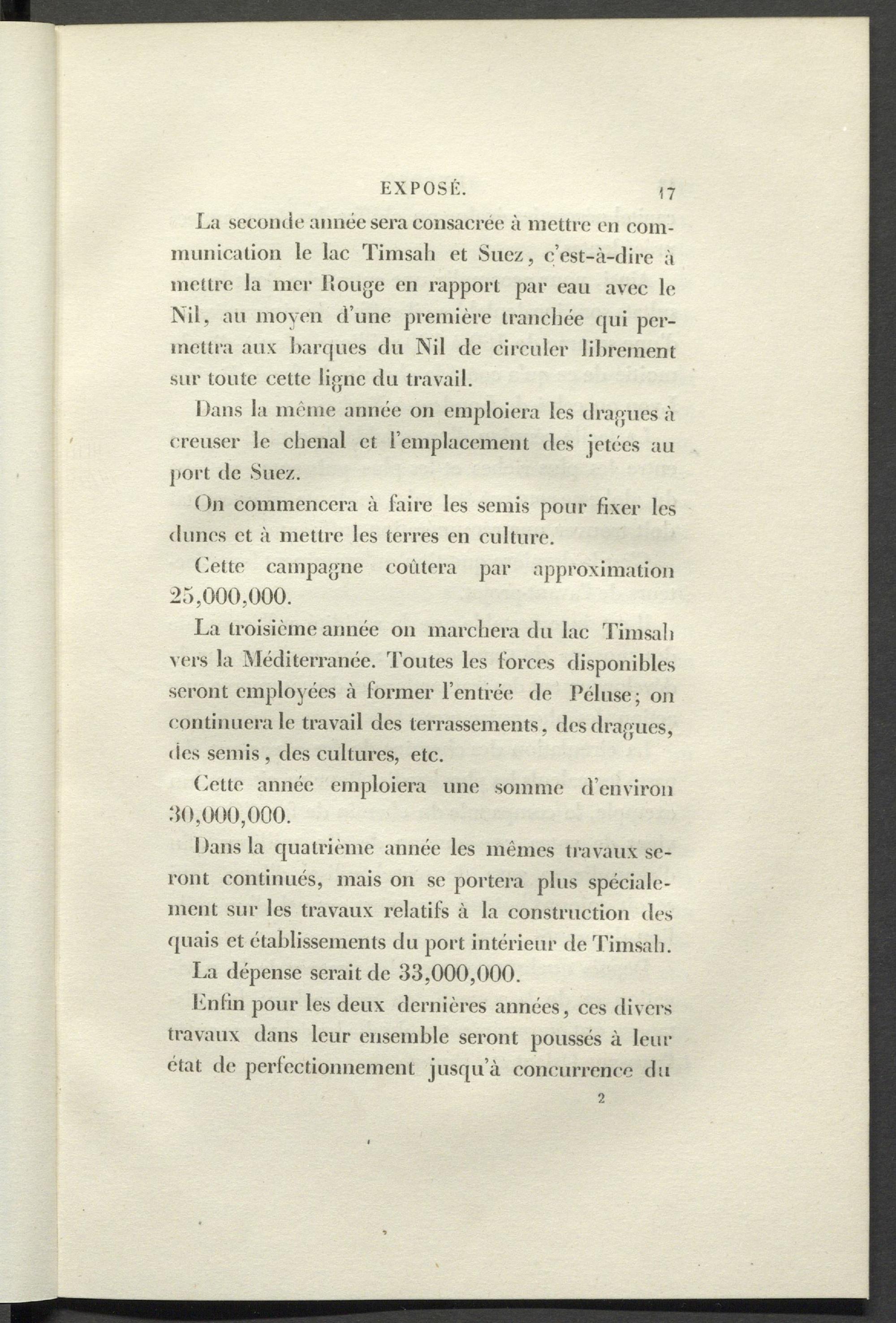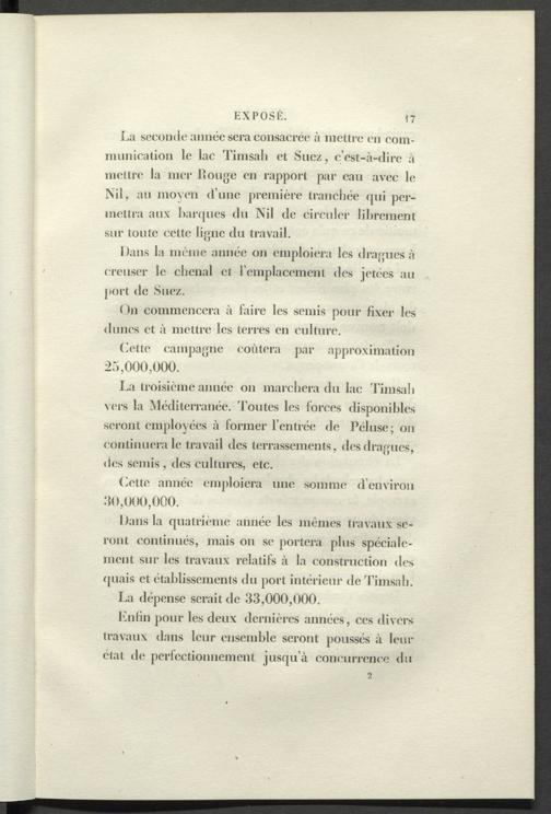 La seconde année sera consacrée à mettre en communication le lac Timsali et Suez, c’est-à-dire à mettre la mer l!ouge en rapport par eau avec le Nil, au moyen d’une première tranchée qui permettra aux barques du Nil de circuler librement sur toute celte ligne du travail.