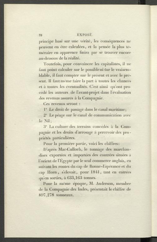 Toutefois, pour convaincre les capitalistes, il ne faut point calculer sur le possible ni sur le vraisemblable, il faut compter sur le présent et avec le présent. 11 faut même faire la part à toutes les chances et à toutes les éventualités, (.l’est ainsi qu’ont procédé les auteurs de l’avant-projet dans l’évaluation des revenus assurés à la Compagnie.