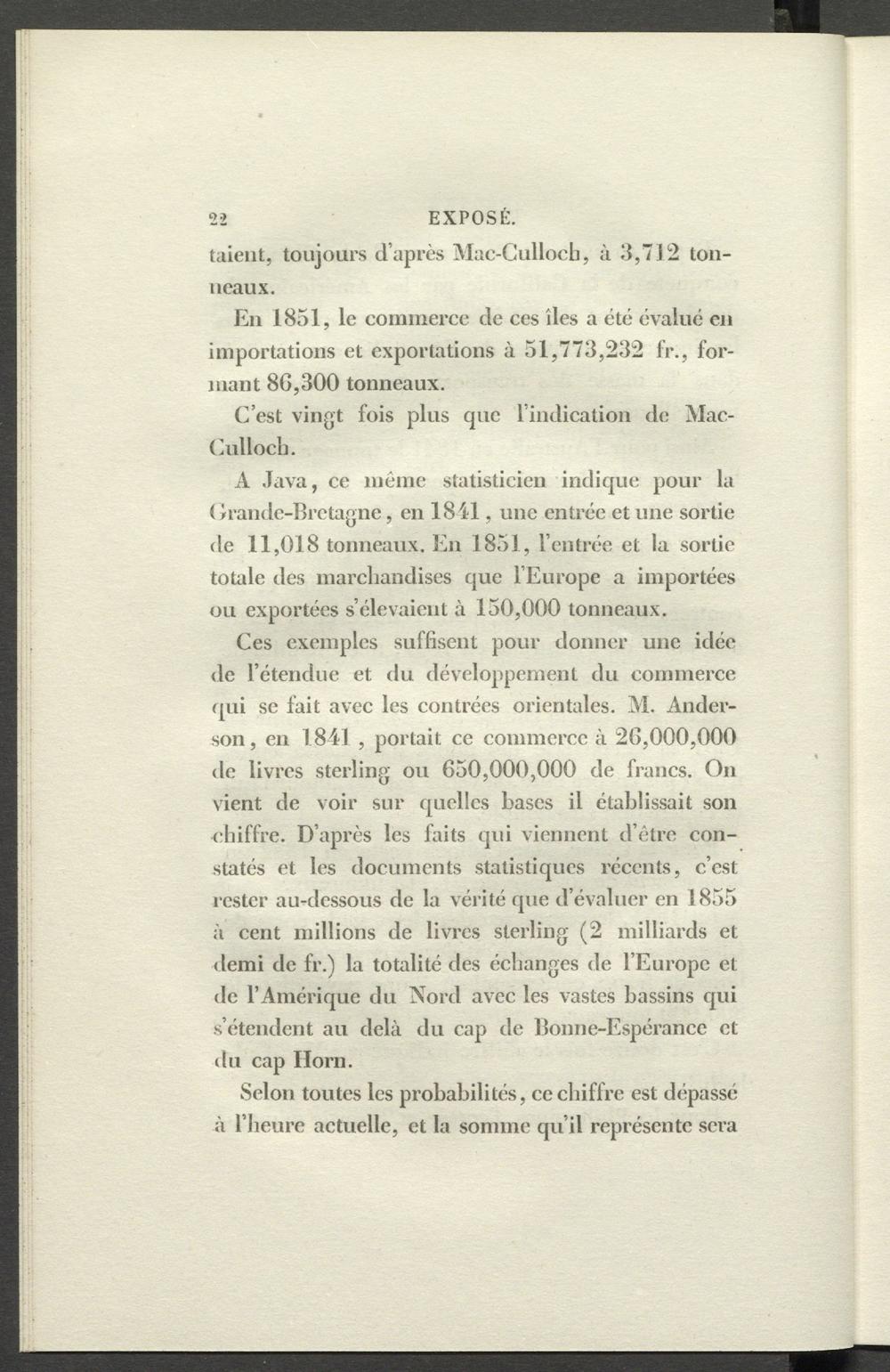 Ces exemples suffisent pour donner une idée de l’étendue et du développement du commerce qui se fait avec les contrées orientales. M. Anderson, en 1.841 , portait ce commerce à 20,000,000 de livres sterling ou 650,000,000 de francs. On vient de voir sur quelles bases il établissait son chiffre. D’apr ès les faits qui viennent d’être constatés et les documents statistiques récents, c’est rester au-dessous de la vérité que d’évaluer en 1855 à cent millions de livres sterling (2 milliards et demi de fr.) la totalité des échanges de l’Europe et de l’Amérique du Nord avec les vastes bassins qui s’étendent au delà du cap de Bonne-Espérance et du cap Horn.