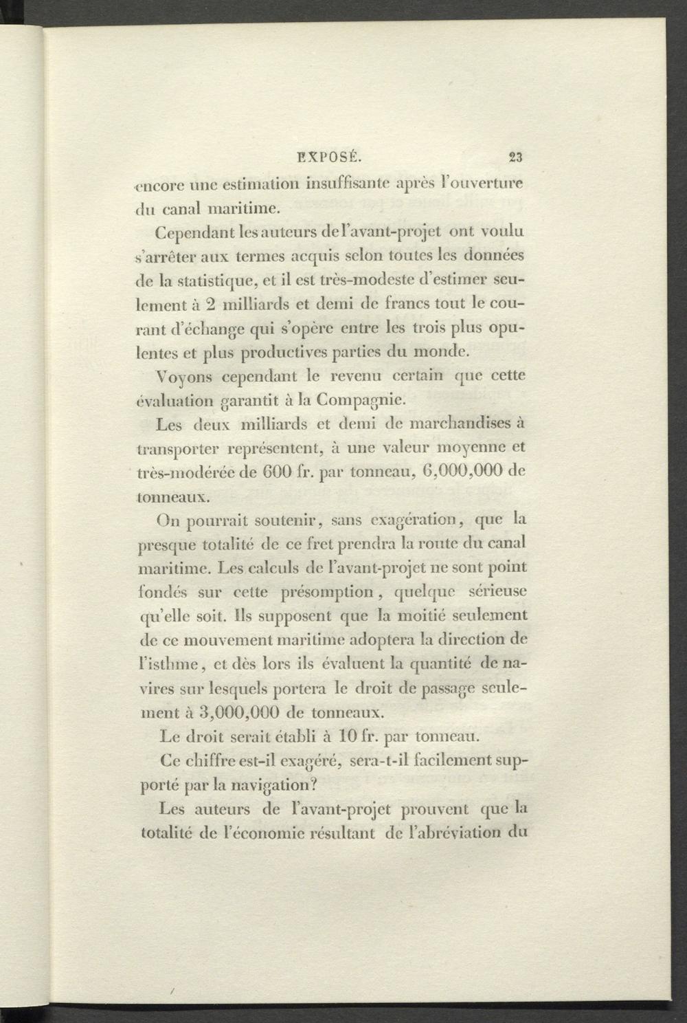 On pourrait soutenir, sans exagération, que la presque totalité de ce fret prendra la route du canal maritime. Les calculs de l’avant-projet ne sont point fondés sur cette présomption, quelque sérieuse ([u’elle soit. Ils supposent que la moitié seulement de ce mouvement maritime adoptera la direction de l’istlnne, et dès lors ils évaluent la quantité de navires sur lesquels portera le droit de passage seulement à 3,000,000 de tonneaux.
