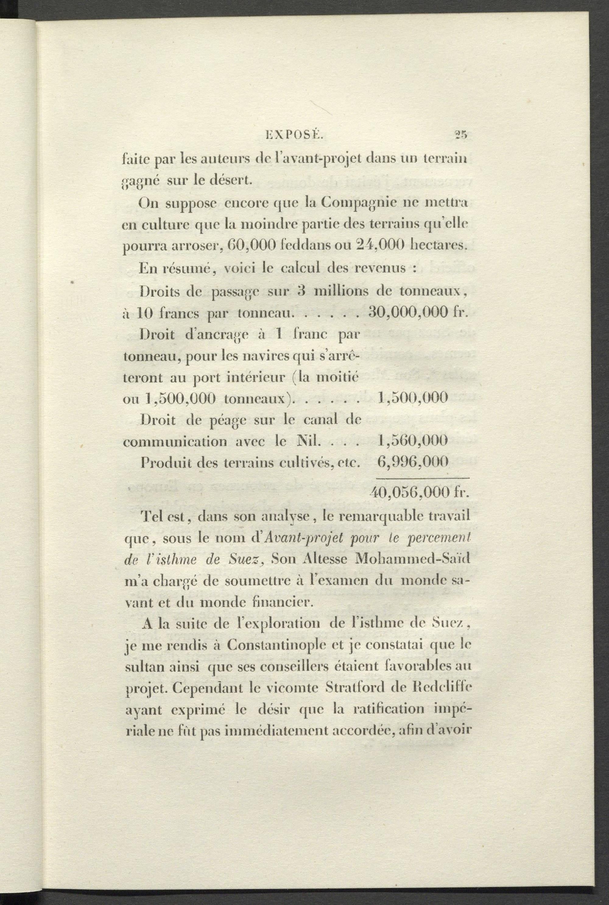 Tel est, dans son analyse, le remarquable travail que, sous le nom d 'Avant-projet pour te percement de l’isthme de Suez, Son Altesse Mohammcd-Saïd m’a chargé de soumettre à l’examen du monde savant et du monde financier.
