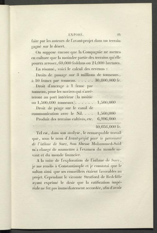 A la suite de l’exploration de l’isthme de Suez, je me rendis à Constantinople et je constatai que le sultan ainsi que ses conseillers étaient favorables au projet. Cependant le vicomte Stratford de Hedcliffe ayant exprimé le désir que la ratification impériale ne rcordée, afin d’avoir