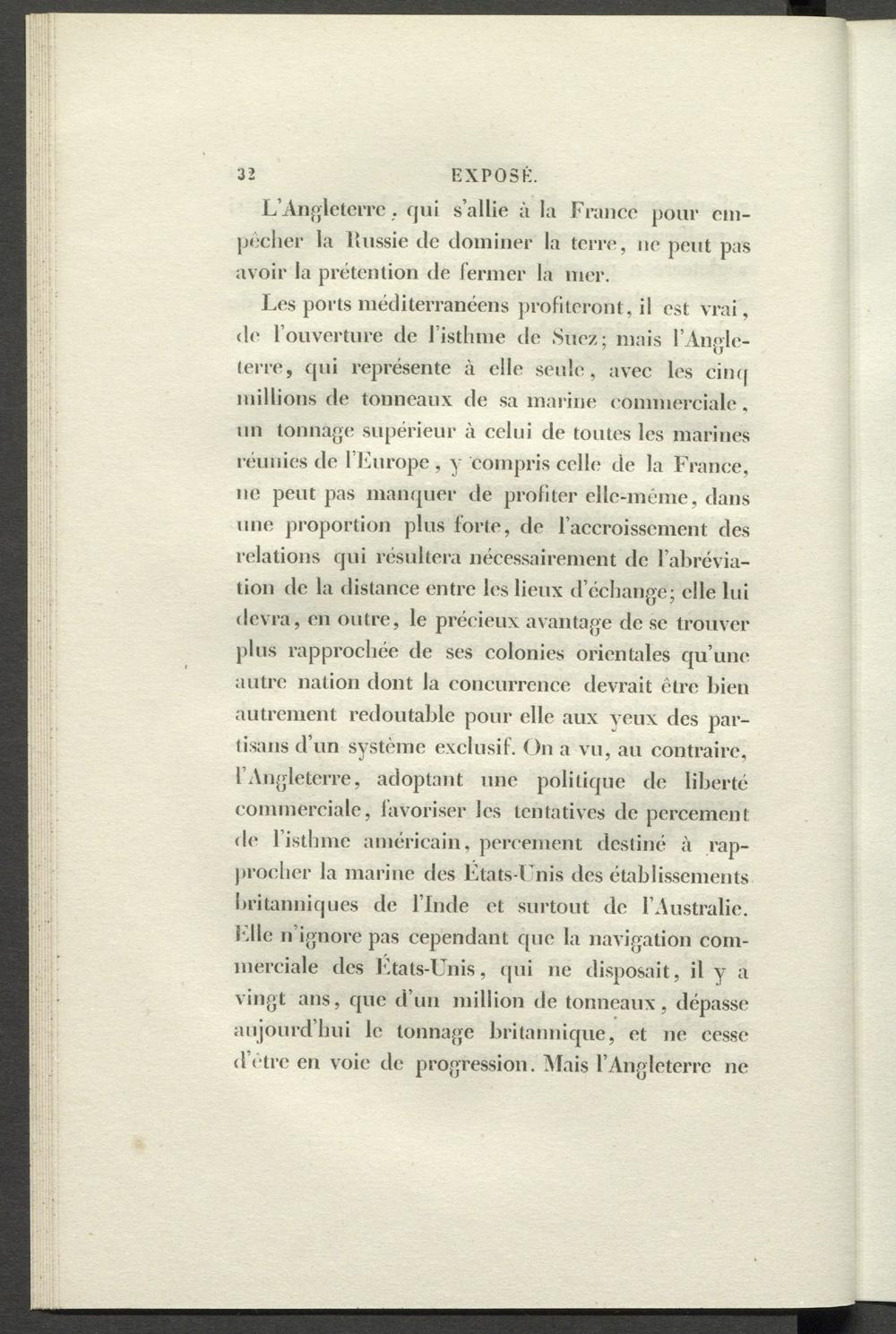 Les ports méditerranéens profiteront, il est vrai, de l’ouverture de l’istlune de Suez; mais l’Angleterre, qui représente à elle seule, avec les cinq millions de tonneaux de sa marine commerciale, un tonnage supérieur à celui de toutes les marines réunies de l’Europe, y compris celle de la France, ne peut pas manquer de profiter elle-même, dans une proportion plus forte, de l’accroissement des relations qui résultera nécessairement de l’abréviation de la distance entre les lieux d’échange; elle lui devra, en outre, le précieux avantage de se trouver plus rapprochée de ses colonies orientales qu’une autre nation dont la concurrence devrait être bien autrement redoutable pour elle aux veux des partisans d’un système exclusif. On a vu, au contraire, l’Angleterre, adoptant une politique de liberté commerciale, favoriser les tentatives de percement de l’istlnne américain, percement destiné à rapprocher la marine des Etats-Unis des établissements britanniques de l’Inde et surtout de l’Australie. Elle n’ ignore pas cependant que la navigation commerciale des Etats-Unis, qui ne disposait, il y a vingt ans, que d’un million de tonneaux, dépasse aujourd’hui le tonnage britannique, et ne cesse d’être en voie de progression. Mais l’Angleterre ne