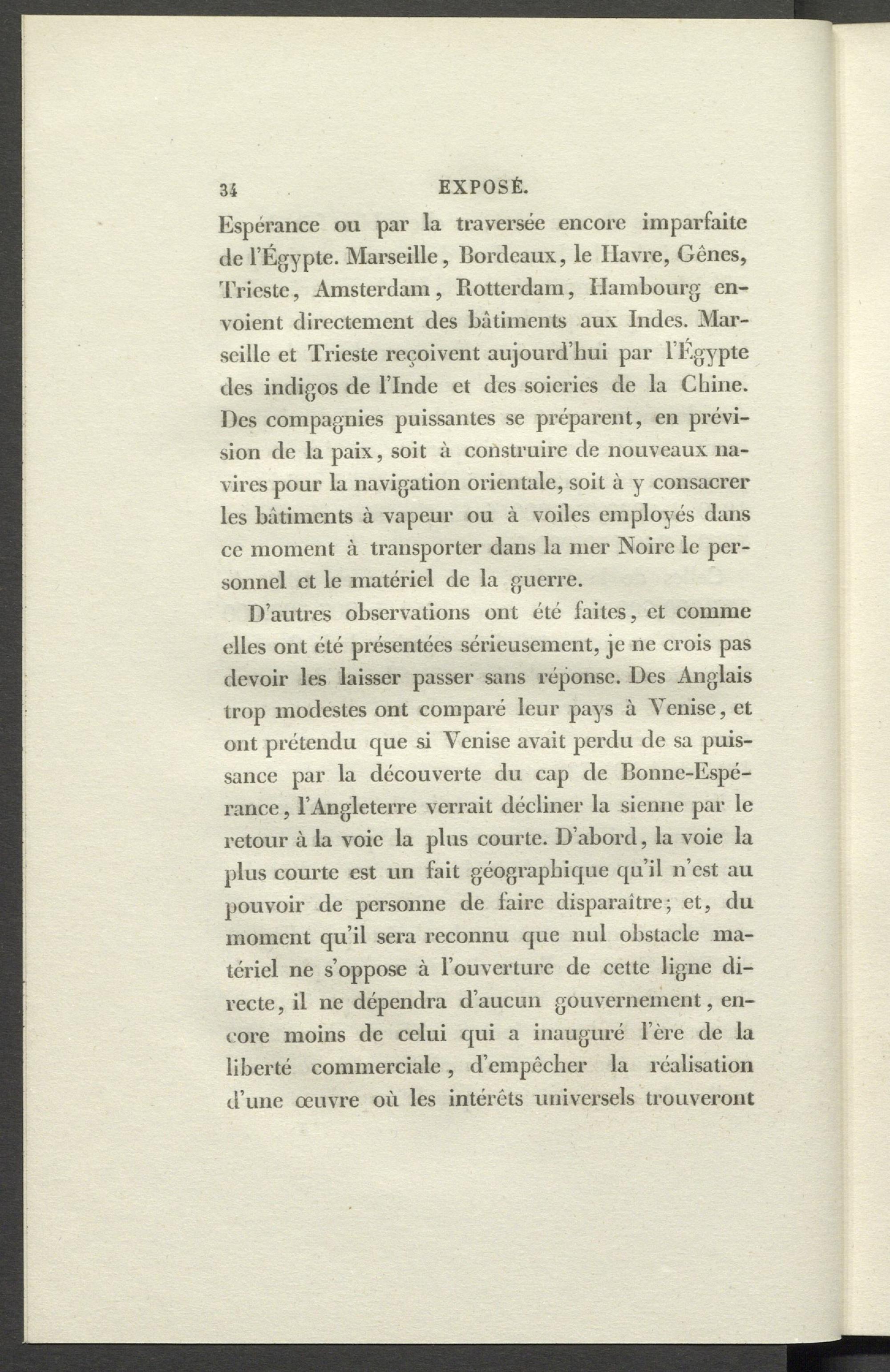 D’autres observations ont été faites, et comme elles ont été présentées sérieusement, je ne crois pas devoir les laisser passer sans réponse. Des Anglais trop modestes ont comparé leur pays à Venise, et ont prétendu que si Venise avait perdu de sa puissance par la découverte du cap de Bonne-Espérance , l’Angleterre verrait décliner la sienne par le retour à la voie la plus courte. D’abord, la voie la plus courte est un fait géographique qu’il n’est au pouvoir de personne de faire disparaître; et, du moment qu’il sera reconnu que nul obstacle matériel ne s’oppose à l’ouverture de cette ligne directe, il ne dépendra d’aucun gouvernement, encore moins de celui qui a inauguré 1ère de la liberté commerciale, d’empêcher la réalisation d’une œuvre où les intérêts universels trouveront