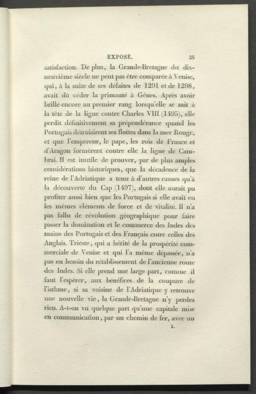 satisfaction. Déplus, la Grande-Bretagne du dix- neuvième siècle ne peut pas être comparée à Venise, qui, à la suite de ses défaites de 1291 et de 1298, avait dû céder la primauté à Gênes. Après avoir brillé encore au premier rang lorsqu’elle se mit à la tête de la ligue contre Charles VIII (1495), elle perdit définitivement sa prépondérance quand les Portugais détruisirent ses flottes dans la mer Bouge, et que l’empereur, le pape, les rois de France et d’Aragon formèrent contre elle la ligue de Cambrai. Il est inutile de prouver, par de plus amples considérations historiques, que la décadence de la reine de l’Adriatique a tenu à d’autres causes qu’à la découverte du Cap (1497), dont elle aurait pu profiter aussi bien que les Portugais si elle avait eu les mêmes éléments de force et de vitalité. 11 n’a pas fallu de révolution géographique pour faire passer la domination et le commerce des Indes des mains des Portugais et des Français entre celles des Anglais. Trieste, qui a hérité de la prospérité commerciale de Venise et qui l’a même dépassée, n’a pas eu besoin du rétablissement de l’ancienne route des Indes. Si elle prend une large part, comme il faut l’espérer, aux bénéfices de la coupure de l’isthme, si sa voisine de l’Adriatique y retrouve une nouvelle vie, la Grande-Bretagne n’y perdra rien. A-t-on vu quelque part qu’une capitale mise en communication, par un chemin de fer, avec un