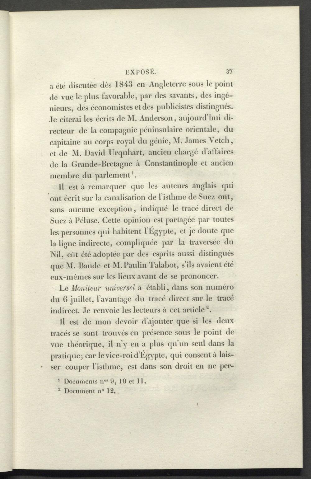 11 est à remarquer que les auteurs anglais qui ont écrit sur la canalisation de l'isthme de Suez ont, sans aucune exception, indiqué le tracé direct de Suez à Péluse. Cette opinion est partagée par toutes les personnes qui habitent l’Egypte, et je doute que la ligne indirecte, compliquée par la traversée du Nil, eut été adoptée par des esprits aussi distingués que M. Baude et M. Paulin Talabot, s’ils avaient été eux-mêmes sur les lieux avant de se prononcer.