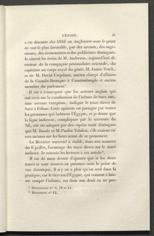a été discutée dès 1843 en Angleterre sous le point de vue le plus favorable, par des savants, des ingénieurs, des économistes et des publicistes distingués, .le citerai les écrits de M. Anderson, aujourd’hui directeur de la compagnie péninsulaire orientale, du capitaine au corps royal du génie, M. James Vetch, et de M. David Urquhart, ancien chargé d’affaires de la Grande-Bretagne a Constantinople et ancien membre du parlement'.