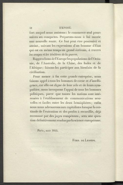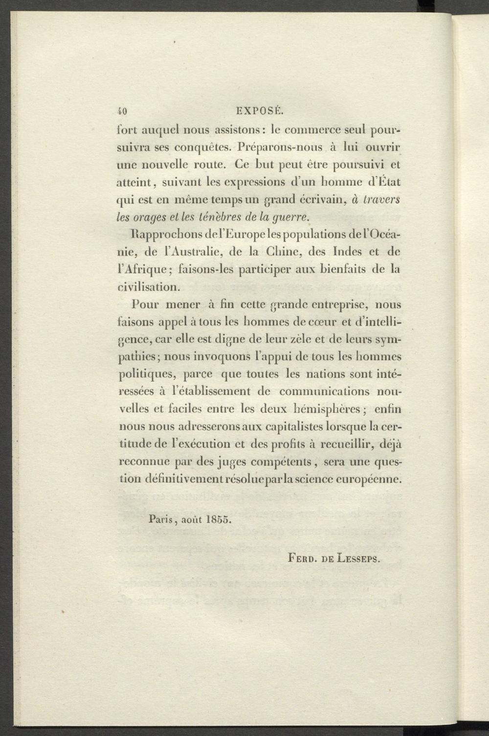 Pour mener à fin cette grande entreprise, nous faisons appel à tous les hommes de cœur et d’intelligence, car elle est digne de leur zèle et de leurs sympathies; nous invoquons l’appui de tous les hommes politiques, parce que toutes les nations sont intéressées à 1’établissement de communications nouvelles et faciles entre les deux hémisphères ; enfin nous nous adresserons aux capitalistes lorsque la certitude de l’exécution et des profits à recueillir, déjà reconnue par des juges compétents, sera une question définitivement résolucparla science européenne.