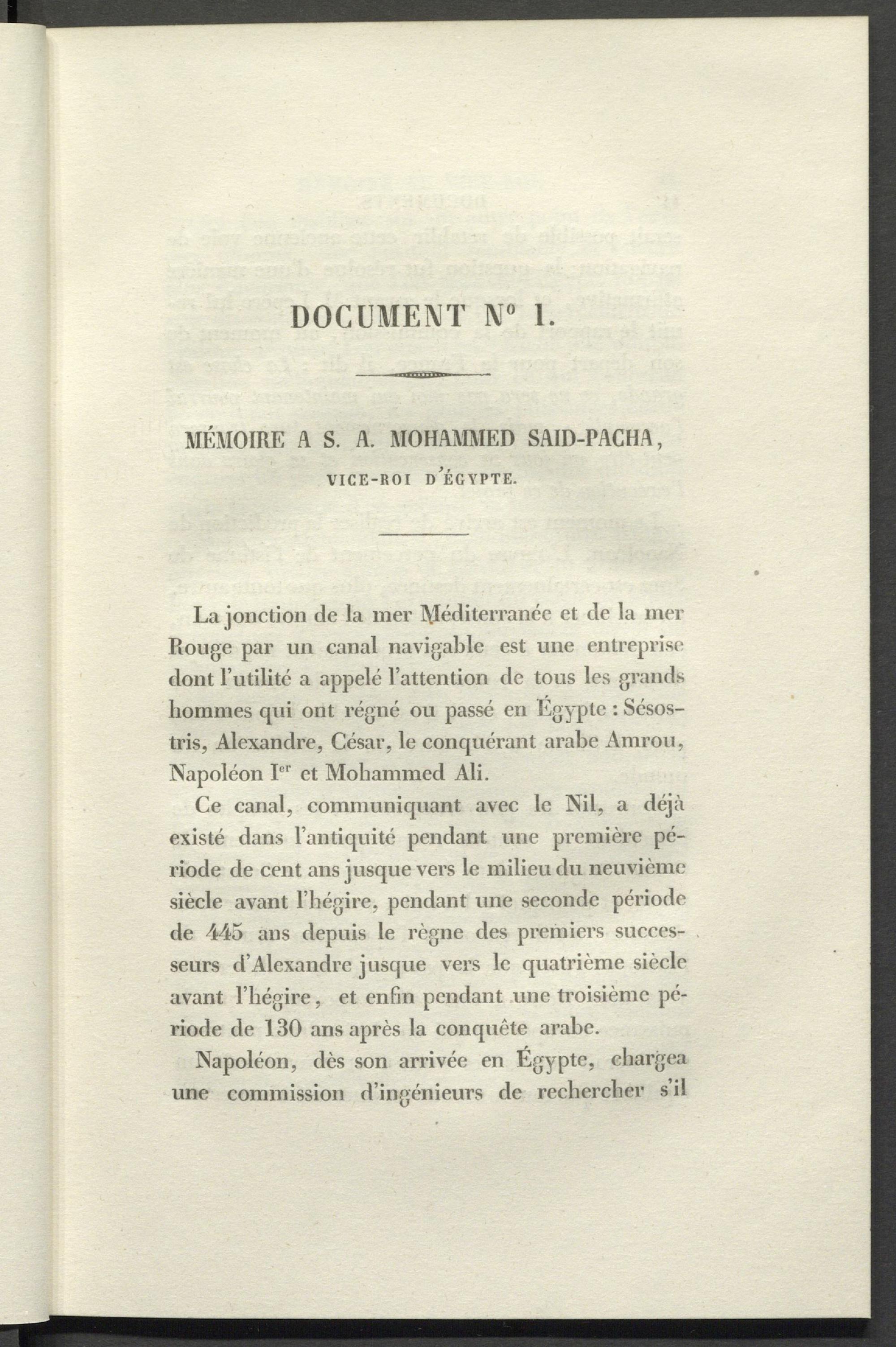 La jonction de la mer Méditerranée et de la mer Rouge par un canal navigable est une entreprise dont l’utilité a appelé l’attention de tous les grands hommes qui ont régné ou passé en Egypte : Sésos- tris, Alexandre, César, le conquérant arabe Amrou, Napoléon I er et Mohammed Ali.
