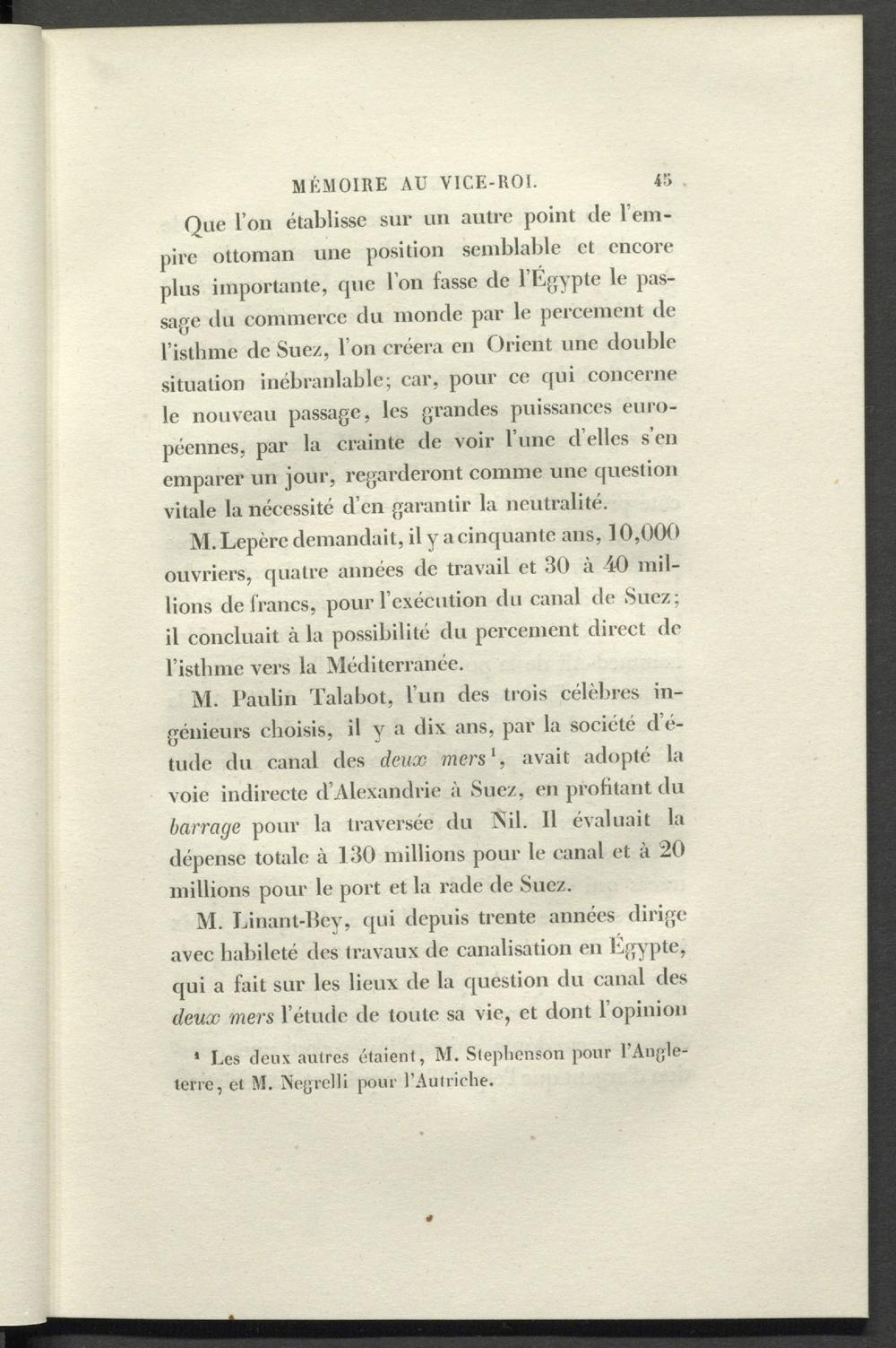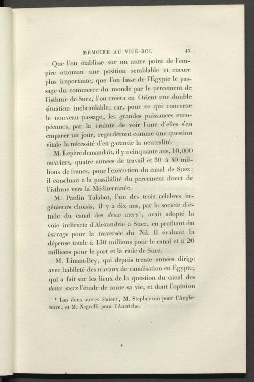 M. Linant-Bey, qui depuis trente années dirige avec habileté des travaux de canalisation en Egypte, qui a fait sur les lieux de la question du canal des deux mers l’étude de toute sa vie, et dont l’opinion