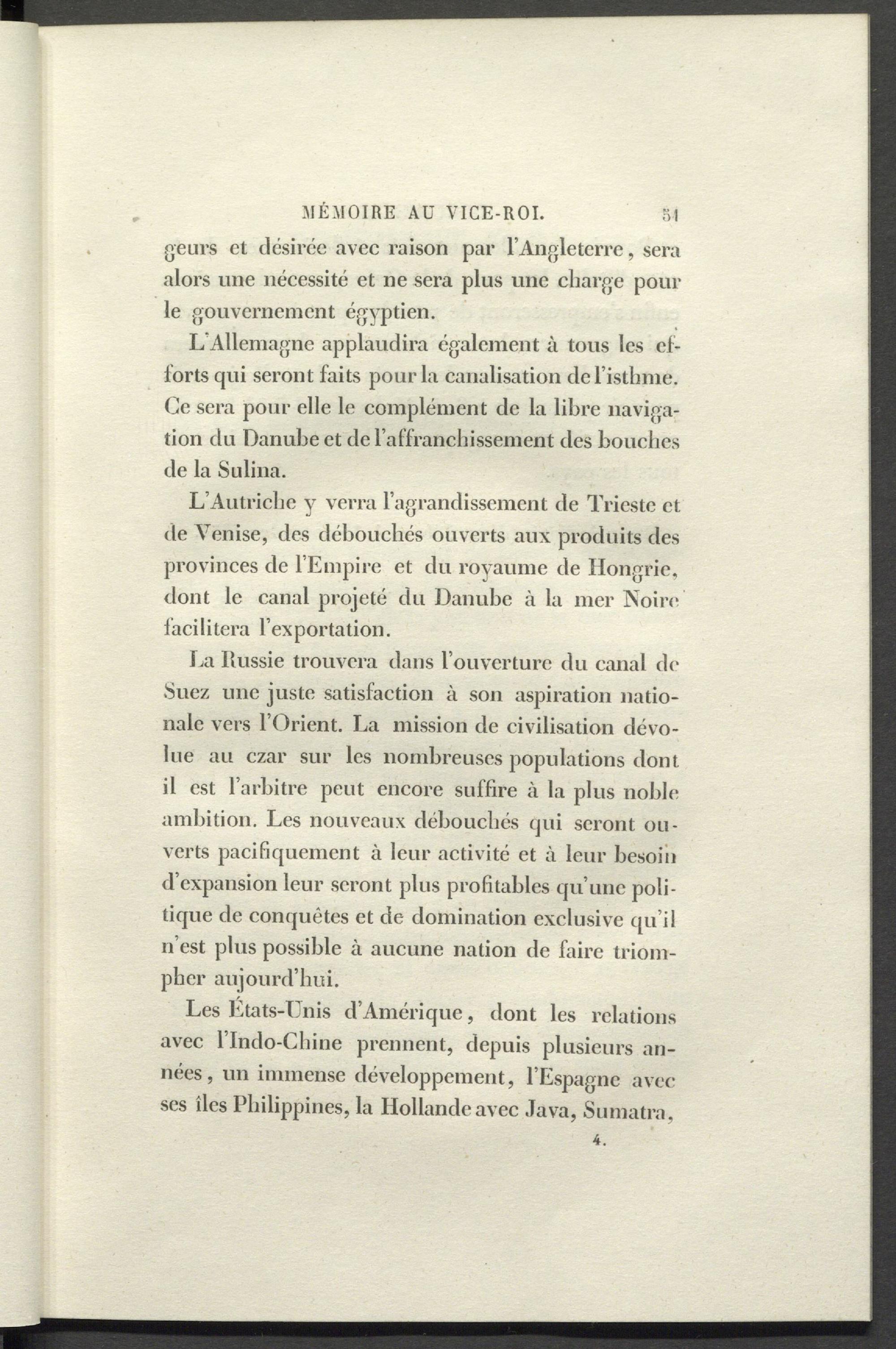 La Russie trouvera dans l’ouverture du canal de Suez une juste satisfaction à son aspiration nationale vers l’Orient. La mission de civilisation dévolue au czar sur les nombreuses populations dont il est l’arbitre peut encore suffire à la plus noble ambition. Les nouveaux débouchés qui seront ouverts pacifiquement à leur activité et à leur besoin d’expansion leur seront plus profitables qu’une politique de conquêtes et de domination exclusive qu’il n’est plus possible à aucune nation de faire triompher aujourd’hui.