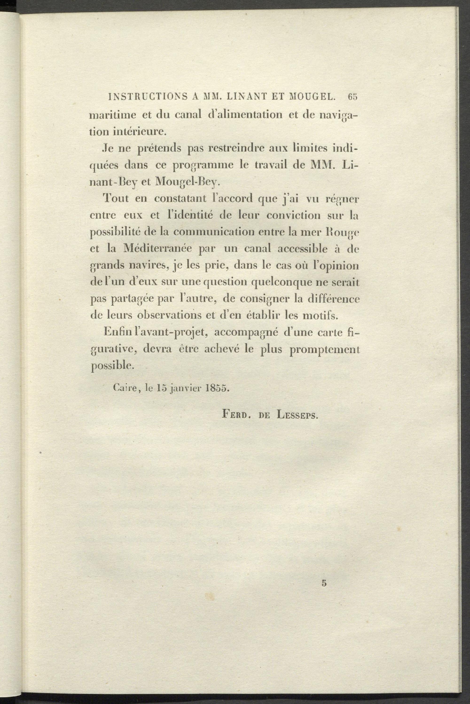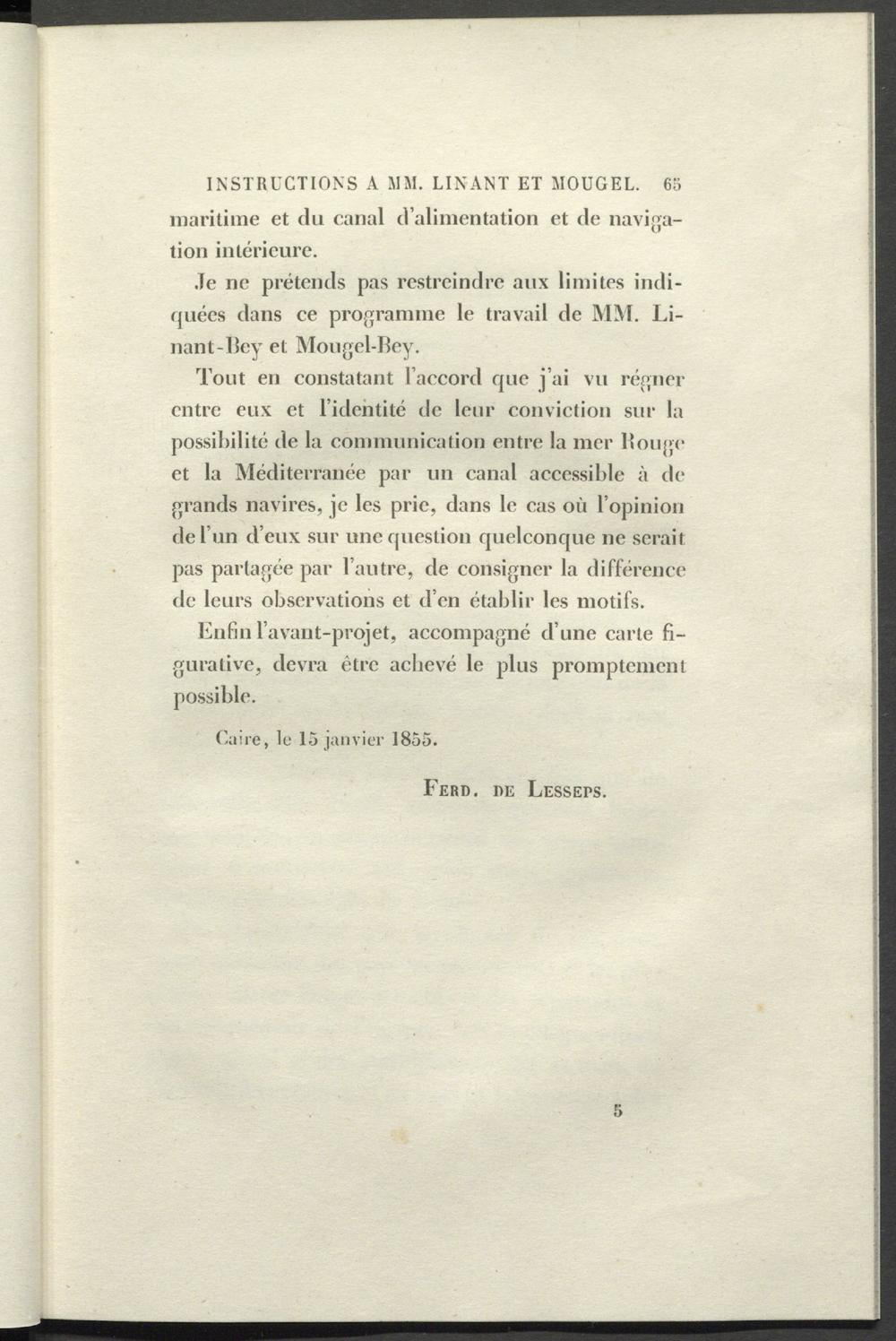 Tout en constatant l’accord que j’ai vu régner entre eux et l’identité de leur conviction sur la possibilité de la communication entre la mer Bouge et la Méditerranée par un canal accessible à de grands navires, je les prie, dans le cas où l’opinion de l’un d’eux sur une question quelconque ne serait pas partagée par l’autre, de consigner la différence de leurs observations et d’en établir les motifs.
