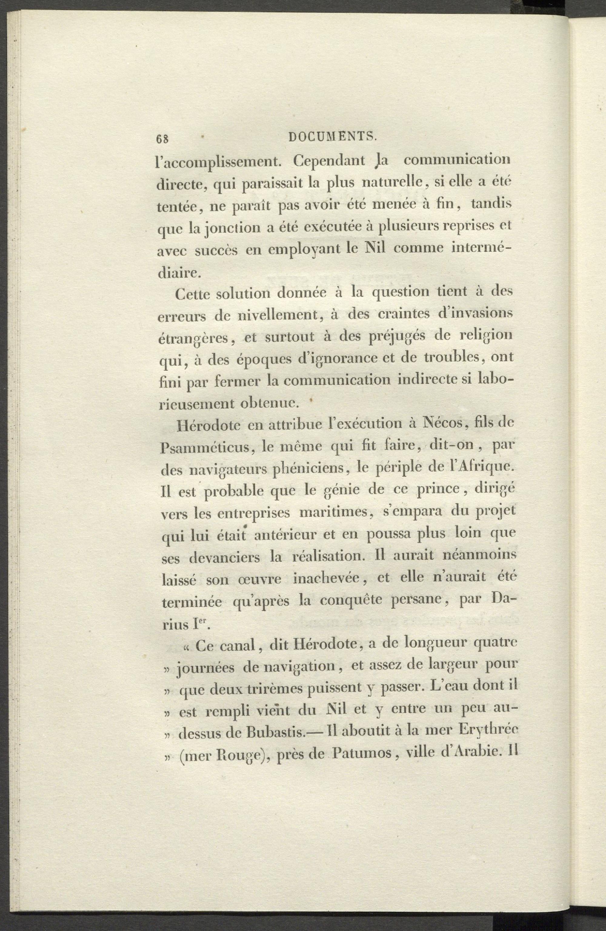 « Ce canal, dit Hérodote, a de longueur quatre » journées de navigation, et assez de largeur pour » que deux trirèmes puissent y passer. L’eau dont il » est rempli vient du Nil et y entre un peu au- « dessus de Bubastis.— Il aboutit à la mer Erythrée » (mer Rouge), près de Patumos, ville d’Arabie. 11